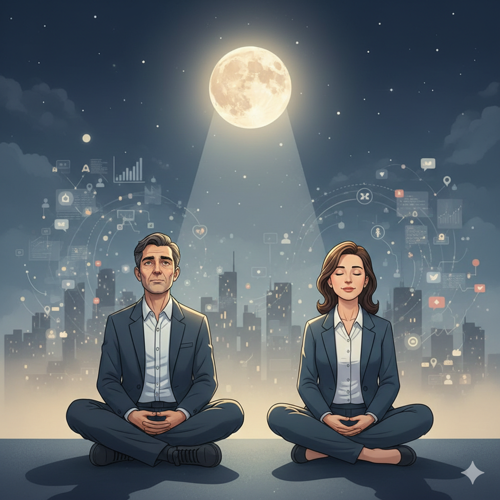한글 이미지 프롬프트: 고요하고 영적인 밤하늘을 배경으로, 달이 중앙에서 부드럽게 빛나고 있다. 달빛은 아래로 떨어져, 단정하고 현대적인 비즈니스 캐주얼 복장을 한 한 중년 남녀(약 40~50대)가 서로 마주 보고 조용히 앉아 명상하는 듯한 모습을 은은하게 비춘다. 남자는 고뇌의 흔적이 서린 깊은 눈빛으로 달을 올려다보고, 여자는 눈을 감고 내면의 평화를 찾는 듯한 표정이다. 이들 뒤편으로는 도시의 실루엣과 복잡한 정보(데이터 그래프, 소셜 미디어 아이콘 등)가 안개처럼 흐릿하게 겹쳐져 있지만, 달빛이 그 모든 것을 뚫고 이 인물들에게 이른다. 부드럽고 따뜻한 달빛이 모든 혼란을 잠재우는 듯하다. 구글 나노 바나나 스타일로 철학적이고 성찰적인 분위기.