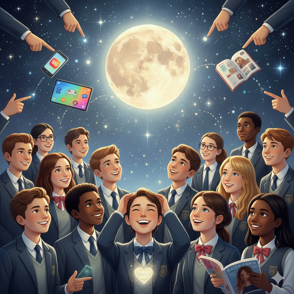 English Image Prompt: A bright and evocative East Asian-style cosmic space. A softly glowing full moon hangs centrally. Below it, teenagers (boys and girls of diverse ethnicities and ages, from middle to high school), dressed in neat school uniforms, are gathered. Initially, they are distracted by 'fingers' pointing in different directions (SNS icons, game screens, study books, trendy fashion). Then, they slowly lift their heads to gaze at the moon, smiling brightly as if finding their inner 'real self'. Moonlight softly illuminates their faces. The background evokes a dreamy and hopeful atmosphere, in a bright and warm picture-book style typical of Nano Banana.