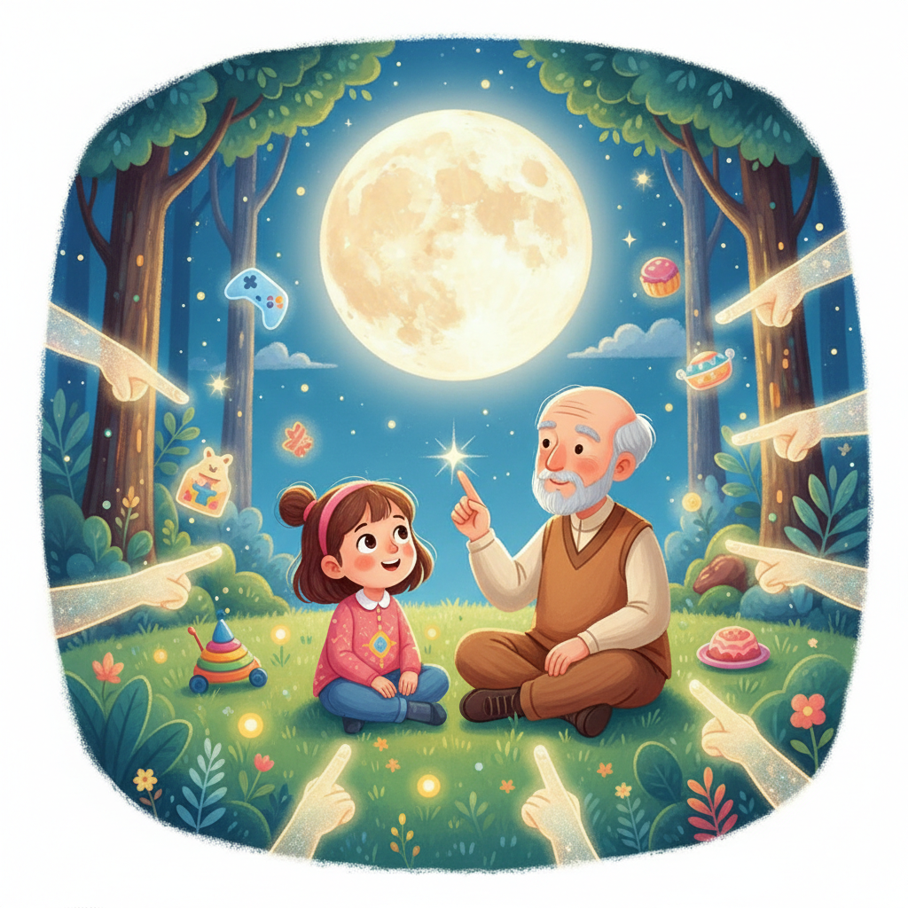 - 이미지: 알록달록한 옷을 입은 반짝이가 환상적인 숲 속에서 부엉이 선생님과 함께 달로 이어지는 빛의 길을 걸어간다. 길의 시작점에는 게임, 사탕 등의 손가락들이 흐릿하게 남아있다. 나노 바나나 스타일의 꿈과 상상의 세계.