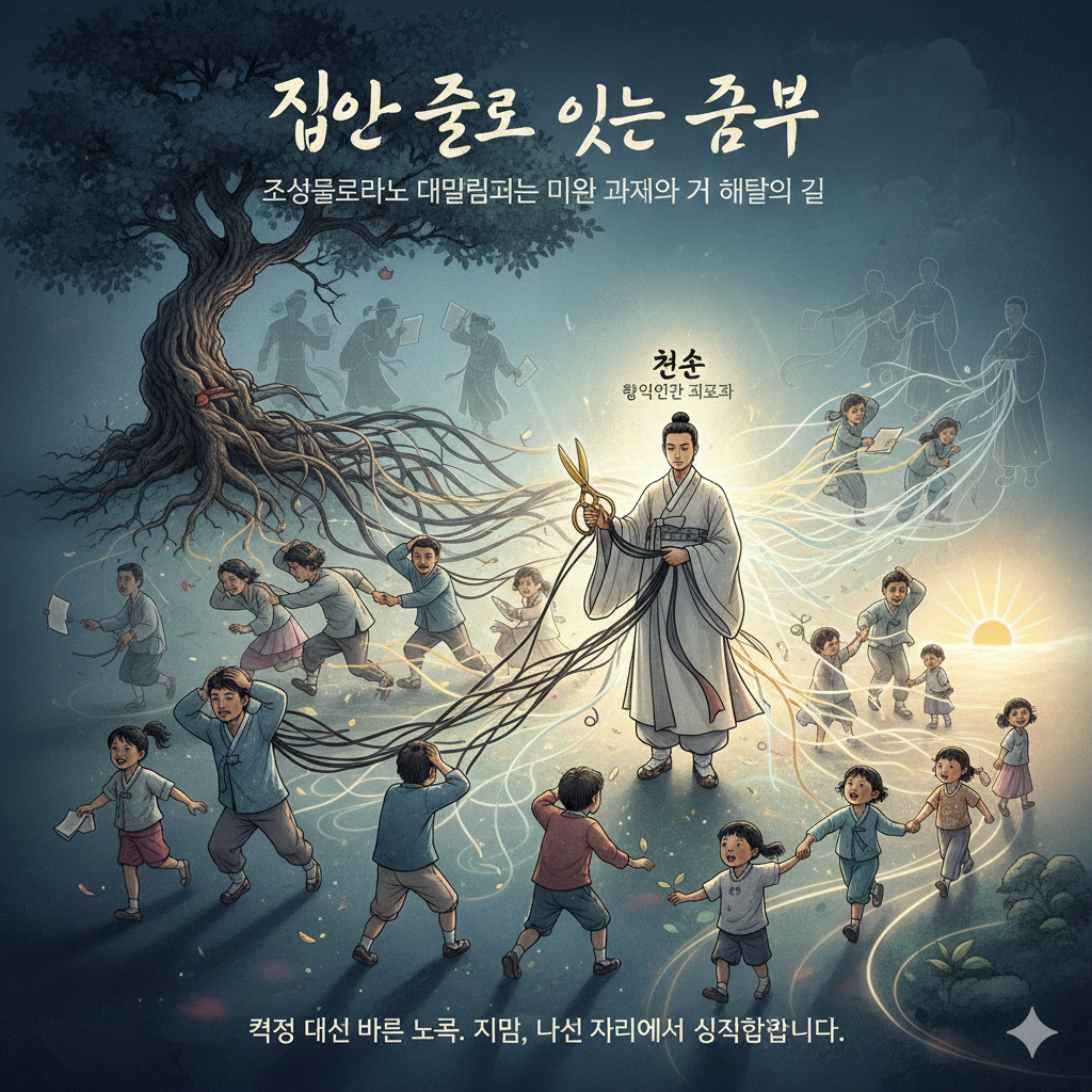 결론적으로, 너무 조급해하거나 매몰되지 마세요. 과거에 누가 가르쳐주는 사람이 없었다고 탓할 필요도 없습니다. 지금부터라도 바르게 가는 길을 '한 뜸 한 뜸' 찾아갈 때, 비로소 '아!~'하는 깨달음이 터져 나와 진정한 지혜가 힘이 됩니다. 우리 자신이 **이 사회를 바르게 사는 '공부'**를 끊임없이 해나가기만 해도, '집안 줄'로 내려오는 모든 문제들은 저절로 정리될 것입니다. 이 시대에 필요한 것은 외부로 향한 의존이 아닌, 내면에서 우러나오는 깊은 성찰과 실천적 지혜입니다.
