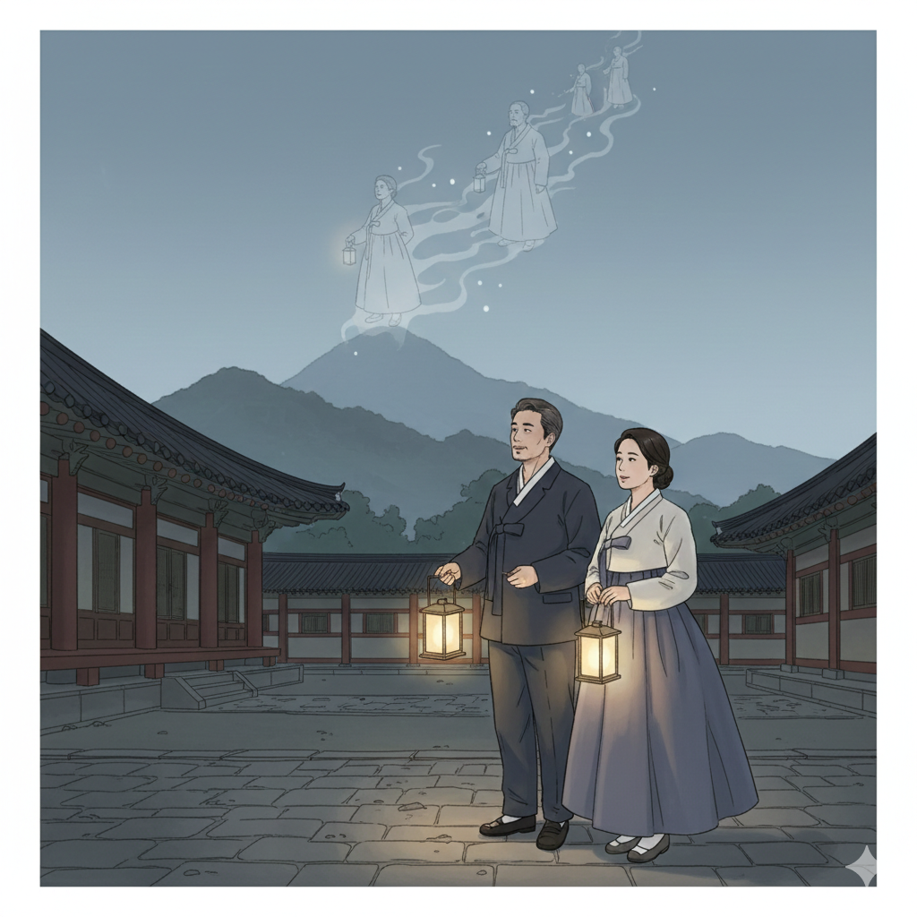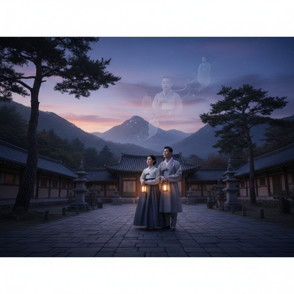 - 이미지 프롬프트 (Korean, 300자 내외): 고즈넉한 사찰 마당에서 단정하게 옷을 입은 중년 남녀가 나란히 서서 멀리 어렴풋이 보이는 산봉우리를 바라보고 있다. 산봉우리 위로는 고요히 사라지는 연기처럼 조상들의 모습이 희미하게 아른거린다. 남녀의 손에는 밝은 빛을 내는 작은 등불이 들려 있고, 그 빛이 조상들의 해탈을 돕는 듯 주변을 은은하게 비추고 있다.