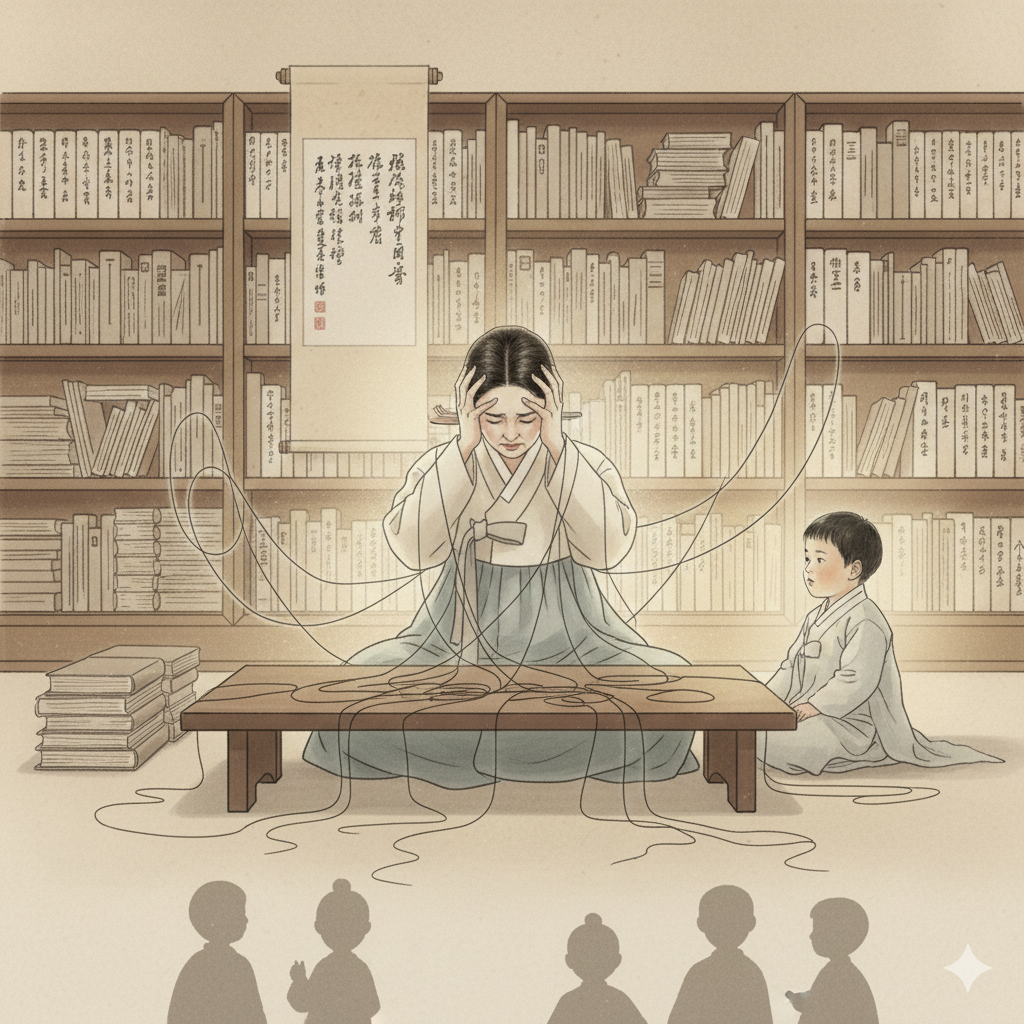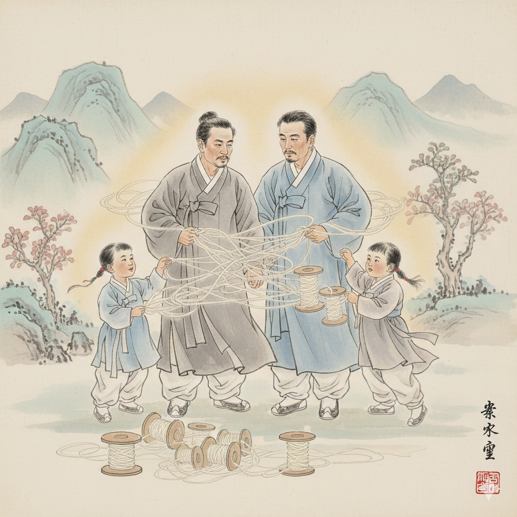 - 이미지 프롬프트 (Korean, 300자 내외): 고요한 동양화풍의 서재에 단정하게 옷을 입은 중년 남녀가 테이블에 앉아있다. 그들 앞에는 복잡하게 얽힌 얇은 실타래들이 놓여있고, 실타래 중 하나는 그들의 아이에게 이어져 있다. 남녀는 깊은 생각에 잠긴 표정으로 실타래를 끊어내려는 듯한 손짓을 하고 있으며, 주변은 은은한 지혜의 빛으로 가득하다.