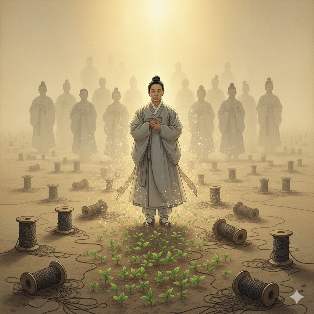 이미지 생성 프롬프트 (Image Generation Prompt): 고요하고 영적인 동양화풍의 우주 공간을 배경으로, 빛나는 지구 위에 단정하게 옷을 입은 한 인물이 양손에 각각 황금빛 씨앗과 끊어진 낡은 실타래를 들고 서 있다. 인물의 등 뒤로는 빛을 향해 평온하게 승천하는 조상들의 실루엣이 보이고, 발아래에는 바르게 뛰어노는 아이들의 형상이 밝게 빛난다. 이 인물의 표정은 강한 결의와 평화를 동시에 담고 있다. In a serene, spiritual East Asian cosmic space, a neatly dressed individual stands on a luminous Earth, holding a golden seed in one hand and a severed, old thread in the other. Behind the figure, silhouettes of ancestors ascend peacefully towards the light, while brightly lit shapes of children play below. The individual's expression conveys both strong determination and tranquility.