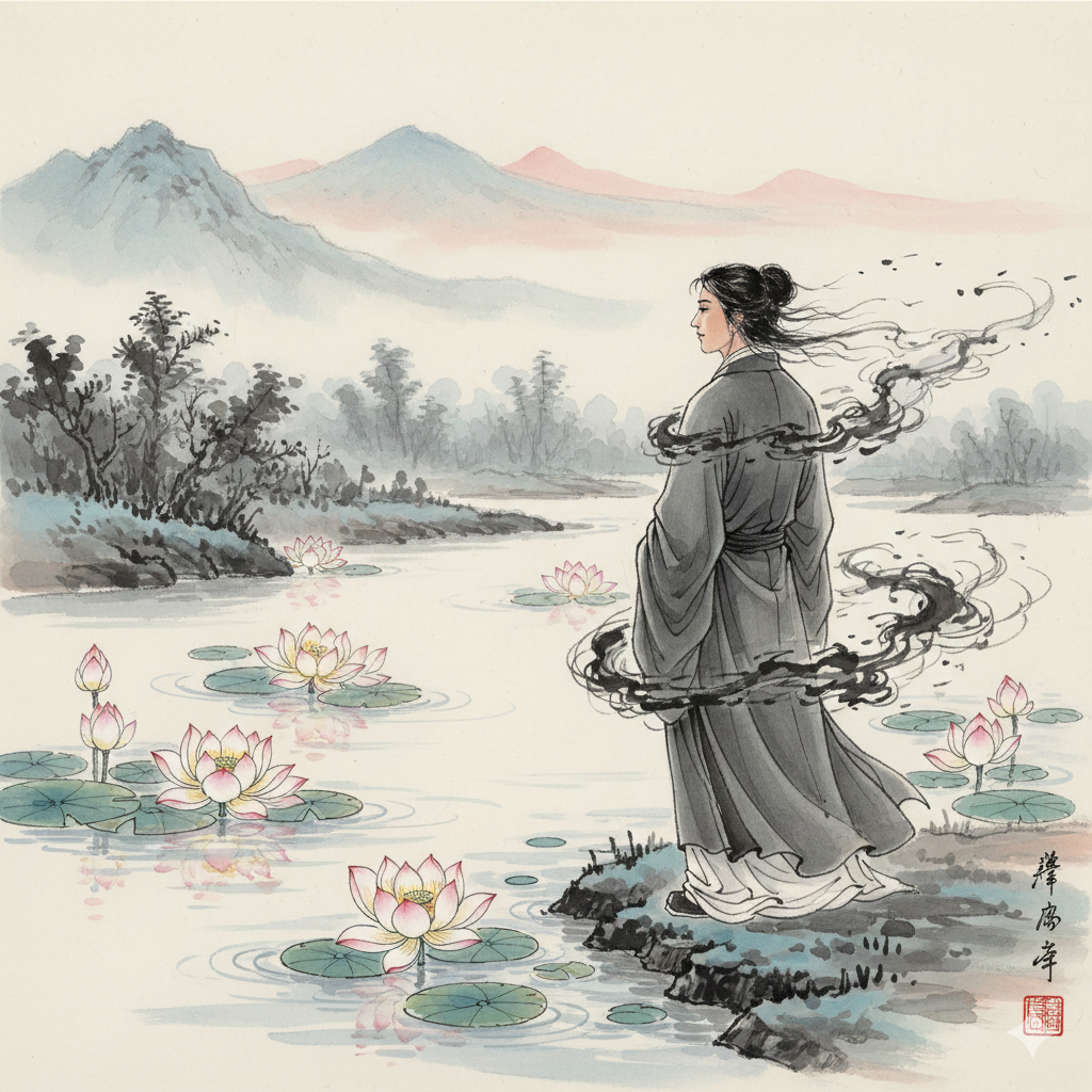 고요하고 영적인 동양화풍의 광활한 들판 한가운데, 단정하게 옷을 입은 인물이 두 손을 가슴에 모으고 명상하듯 서 있다. 그의 발밑에는 수많은 낡고 얽힌 실타래들이 놓여 있지만, 그 중 몇몇은 이미 끊어져 고요한 빛으로 흩어지고 있다. 인물의 등 뒤로는 빛을 향해 고요히 승천하는 조상들의 실루엣이 보이고, 그 앞에는 막 싹을 운 듯 푸르고 싱싱한 어린 새싹들이 돋아나고 있다. 모든 요소들이 희망과 해탈, 그리고 새로운 시작의 강한 에너지를 발산한다. Image Prompt: In the middle of a vast, tranquil, and spiritual East Asian-style field, a neatly dressed individual stands in meditation, hands clasped at their chest. At their feet lie numerous old, tangled threads, some already broken and dispersing into quiet light. Behind the figure, silhouettes of ancestors ascend peacefully towards the light, and in front, fresh, green sprouts emerge, symbolizing new beginnings. All elements radiate a strong energy of hope, liberation, and new beginnings.