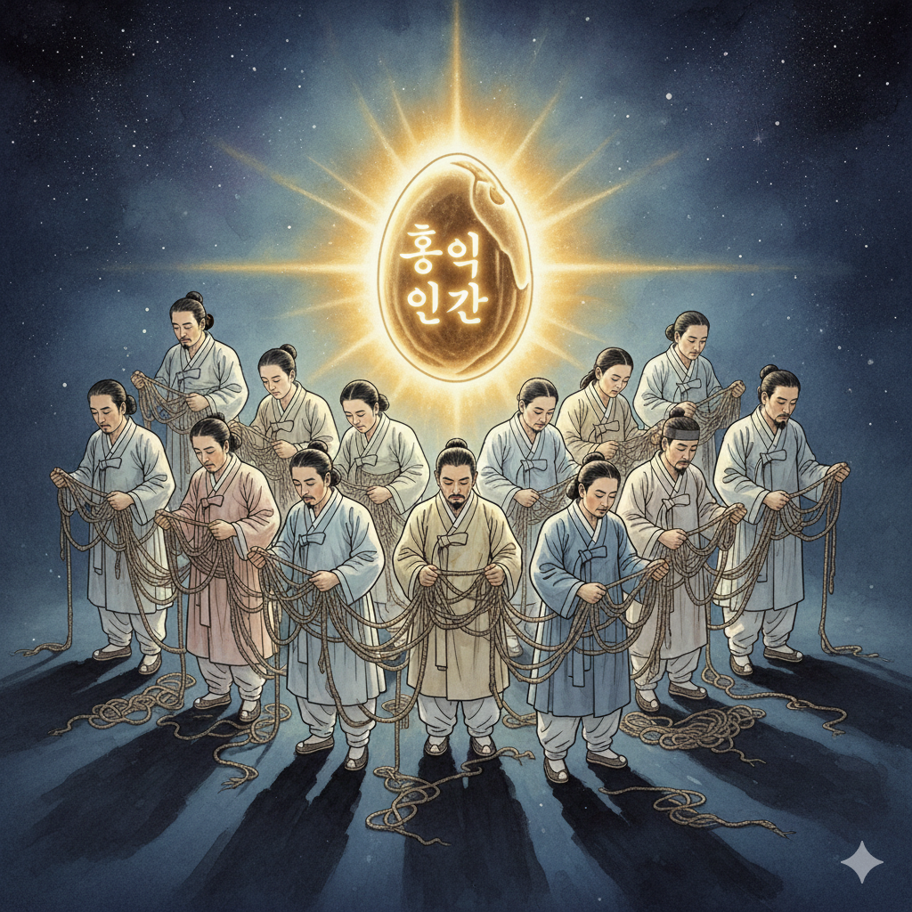 고요하고 영적인 동양화풍의 우주 공간을 배경으로, 지혜와 가능성을 상징하는 투명한 빛의 실타래들이 끊임없이 펼쳐져 있다. 이 실타래들 중 일부는 어둡고 낡은 '집안 줄'의 형태로 아래로 뻗어 내려가 고통스러워하는 조상들의 희미한 실루엣에 닿아있고, 다른 일부는 찬란하게 빛나며 위로 솟아올라 미래의 희망을 상징하는 밝게 웃는 아이들의 모습을 감싸 안고 있다. 중앙에는 단정하고 현대적인 옷을 입은, 성별과 연령을 알 수 없는 한 인물이 양손으로 어둠의 실타래를 끊어내고 밝은 빛의 실타래를 엮어내듯 균형을 잡고 서 있다. 인물의 표정에는 깊은 통찰과 확신, 그리고 무한한 자비심이 어려 있으며, 그의 머리 위로는 '천손', '홍익인간', '사회 부모'를 상징하는 빛나는 문자들이 둥글게 떠돈다. 이 모든 요소들이 조화롭게 어우러져 세대 간의 책임, 해탈, 그리고 새로운 시대의 리더로서의 사명을 동시에 표현하는 복합적인 콜라주 이미지다. Image Prompt: In a serene and spiritual East Asian-style cosmic space, transparent, luminous threads, symbolizing wisdom and potential, stretch out infinitely. Some of these threads are dark and tangled, forming an "ancestral lineage" that descends to touch the faint, suffering silhouettes of ancestors. Other threads glow brilliantly, rising upwards to embrace the brightly smiling figures of children, symbolizing future hope. In the center, a neatly dressed, gender- and age-neutral individual stands balanced, seemingly severing the dark threads and weaving the luminous ones with both hands. The figure's expression holds deep insight, conviction, and boundless compassion. Above their head, glowing characters symbolizing "Heavenly Descendant," "Hongik Ingan," and "Social Parent" float in a circle. All elements harmoniously blend into a complex collage, simultaneously expressing intergenerational responsibility, liberation, and the mission of a new era's leader.