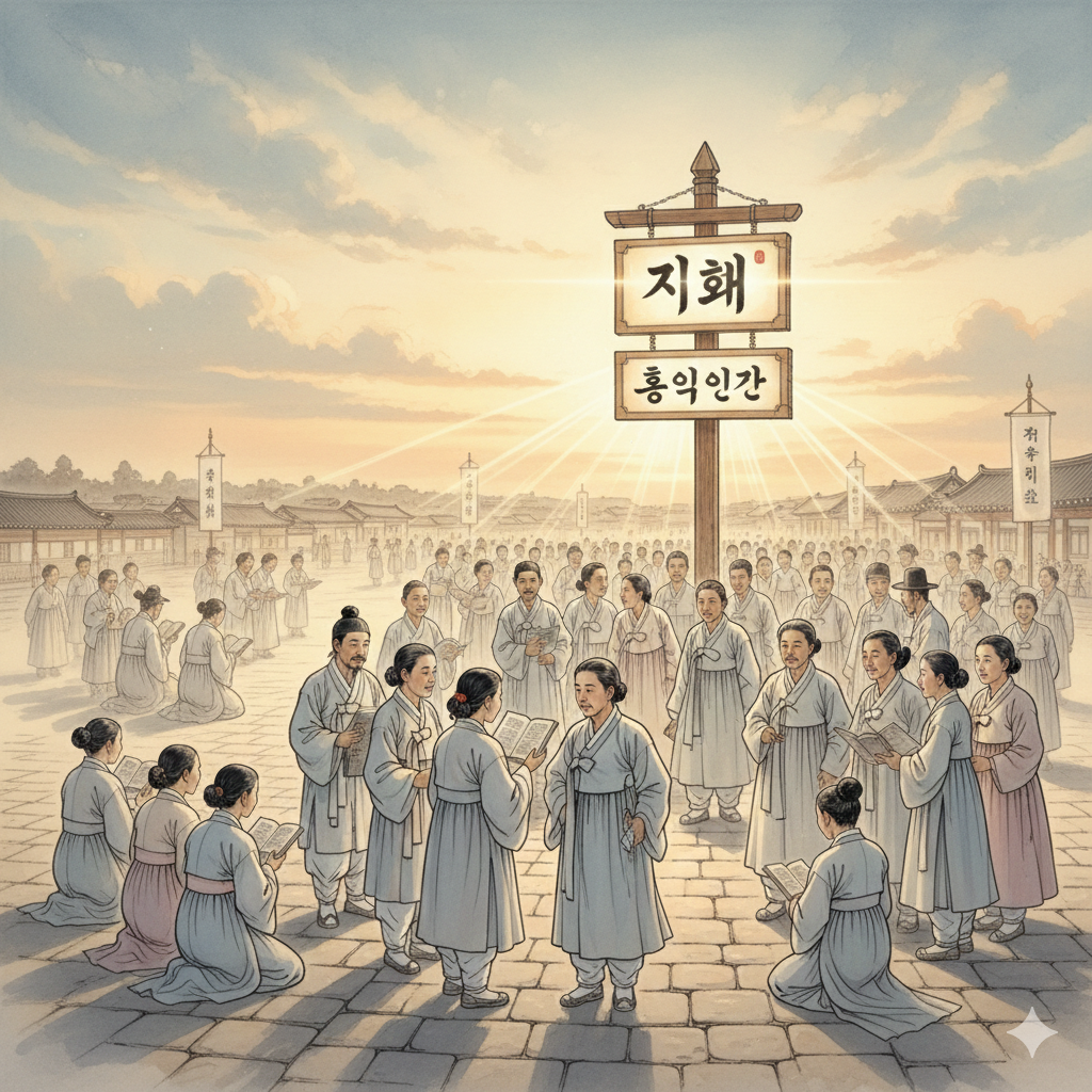 - 이미지 프롬프트 (Korean, 300자 내외): 넓고 탁 트인 광장에 단정하게 옷을 입은 다양한 연령대의 사람들이 모여 토론하고 있다. 그들 중 몇몇은 손에 책이나 지도를 들고 있으며, 한쪽에서는 무릎 꿇고 기도하는 사람들이 사라지는 실루엣으로 표현된다. 중앙에는 '지혜'와 '홍익인간'이라고 적힌 밝게 빛나는 표지판이 서 있고, 모든 사람의 얼굴에는 미래를 향한 진지함과 희망이 비친다.