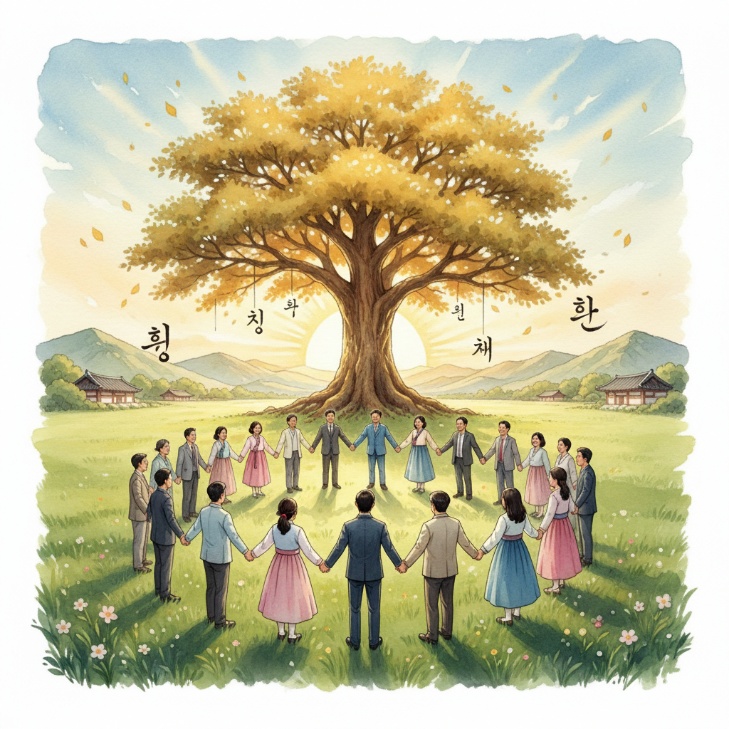 - English: At serene dawn, a magnificent Tree of Life glows on a vast, blue East Asian style meadow. Beneath the tree, neatly dressed people of various ages gather, holding hands with warm smiles. Golden leaves inscribed with Hangul words 'Hope', 'Healing', 'Wisdom' flutter above them. A rising sun in the distance heralds a 'new beginning', creating a moving and peaceful East Asian style collage.