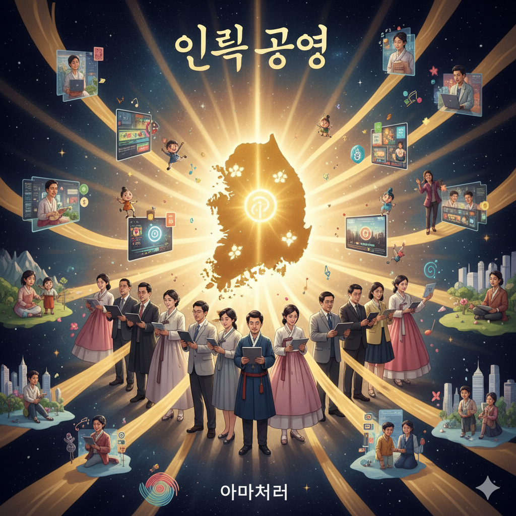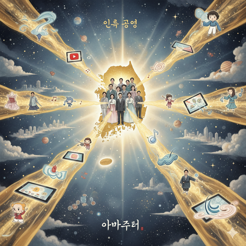- English: In a serene, East Asian style cosmic space, a luminous map of South Korea pulses like a colossal 'heart of wisdom'. All over Earth, 'Truth Production Creators' emit golden energy through diverse 'cultural works', appearing as if AI and humans dance harmoniously together. A 'Hongik Ingan' logo envelops the Earth, as happy citizens worldwide hold hands and smile brightly, creating the future in a grand and hopeful East Asian style collage.