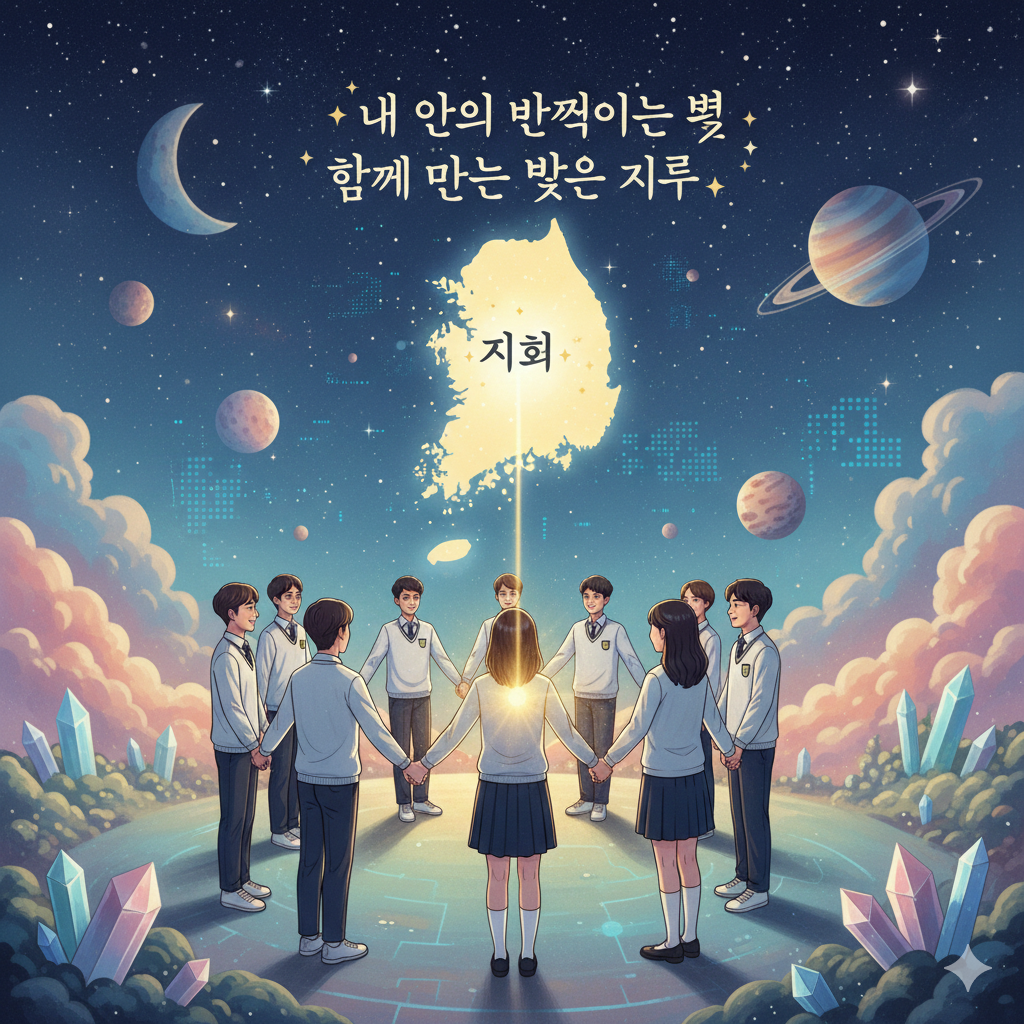 - 한글: 고요하고 별들이 반짝이는 신비로운 우주를 배경으로, 단정하고 현대적인 교복을 입은 청소년들이 밝게 웃으며 손을 잡고 서 있습니다. 그들 중 한 명의 심장에서 황금빛 '지혜'의 빛이 뿜어져 나와 빛나는 대한민국 지도와 연결됩니다. 지도는 동화 같은 우주 행성과 AI를 상징하는 희미한 디지털 문양 위에 떠 있으며, 이 모든 요소가 '내 안의 반짝이는 별'을 발견하고 친구들과 함께 밝은 미래를 만들어가는 희망찬 비전을 표현하는 동화풍 콜라주입니다.
