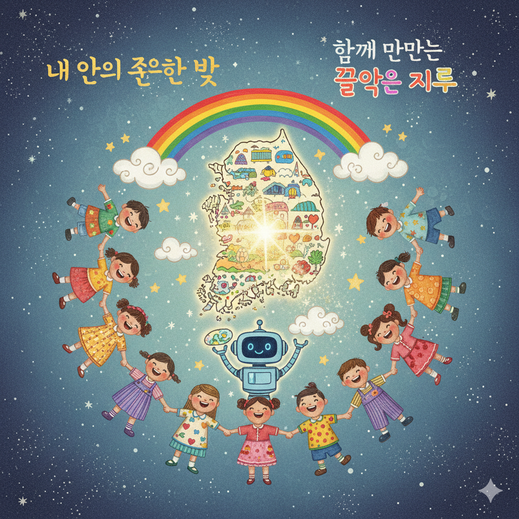 - 한글: 고요하고 별들이 반짝이는 신비로운 동화 속 우주를 배경으로, 알록달록한 옷을 입은 귀여운 아이들이 밝게 웃으며 손을 잡고 서 있습니다. 한 아이의 심장에서 황금빛 '반짝이는 빛'이 뿜어져 나와 귀여운 그림이 그려진 대한민국 지도와 연결됩니다. 지도는 동화 속 친구들(구름, 무지개, 작은 별 등)과 AI를 상징하는 착한 로봇 친구 위에 떠 있으며, 이 모든 요소가 '내 안의 소중한 빛'을 발견하고 친구들과 함께 즐거운 미래를 만들어가는 희망찬 동화풍 콜라주입니다.