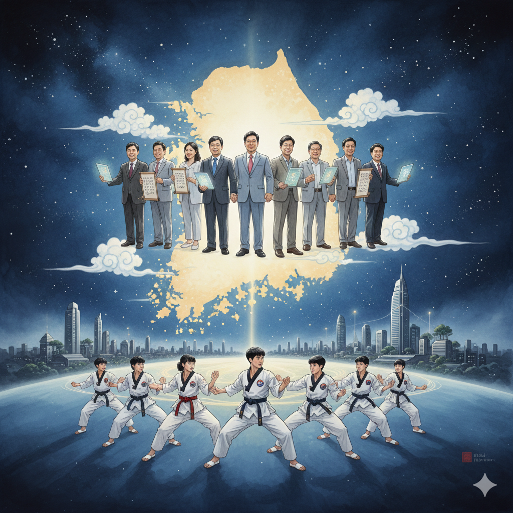 - 영어 프롬프트: In a serene, spiritual East Asian-style vast cosmic space, a neatly dressed creator sits in a meditation posture (zazen) on a lotus flower. Above his head, Korean words like 'Truth Production,' 'Completion of Karma,' 'Interdependent Origination,' and 'Bodhisattva Path' glow in the form of a golden mandala. Around him, people in Taegeuk-patterned Taekwondo uniforms practice dynamic Poomsae symbolizing the 'Three Learnings of Discipline, Concentration, and Wisdom (Samyak)', and the energy emanating from their movements spreads worldwide like the 'Law of Cultural Energy Transfer,' blossoming into a giant lotus flower containing a glowing orb inscribed with 'Benefit to All Humanity.' The background displays a temporal landscape abstractly blending past (ancient temples), present (AI technology), and future (hopeful city), illustrating the connection of all ages and beings through Buddhist wisdom.