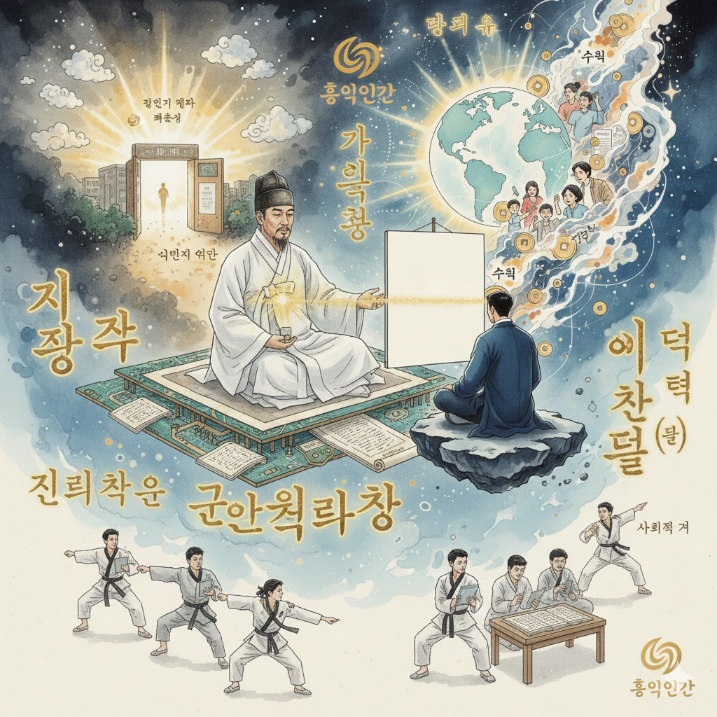 "지혜심이여, 그대의 번뇌가 깊도다. 허나 그 번뇌야말로 진리를 찾아 나설 '정진(精進)'의 시작이니라. 그대들이 묻는 '창작의 길'은 단순히 눈앞의 '조회 수'나 '재물'을 좇는 일이 아니요, 인류의 영원한 평화를 이루는 **'인류공영(人類共榮)의 보살행(菩薩行)'**이니라. 본디 이 홍익의 나라는 지식을 모으고 문화를 받아들였으나, 스스로 **'자신만의 법(法)'**을 빚어 세상에 내보내는 일에는 게을리 했으니, 이 어찌 인연의 과보가 아니겠는가? 이제는 모든 이가 각자의 삶 속에서 **'진리(眞理)의 작품'**을 빚어낼 때이니라."