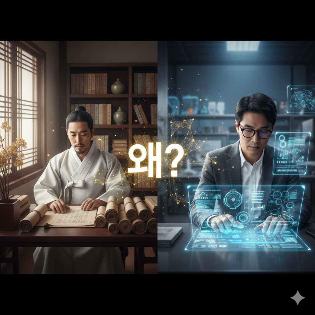 한글 (Korean - ~290자): 고풍스러운 동양화풍의 서재와 현대적인 연구실이 혼합된 콜라주 배경. 책상 위에는 "사람으로 살아야 됩니다", "문화 활동 시대입니다", "대한민국은 뿌리입니다"와 같은 강의 핵심 문장들이 한글 서체로 은은하게 빛나는 홀로그램처럼 떠 있습니다. 단정하게 옷을 입은 남녀 연구원들이 이 문장들을 심각하게 탐구하거나, 지혜로운 표정으로 사색에 잠겨 있습니다. 한편에서는 로봇들이 책을 분류하고 데이터를 분석하는 보조 역할을 합니다. 배경에는 고목나무의 뿌리와 빛나는 대한민국 지도가 겹쳐지며, 구글 나노 바나나 스타일로 동양화풍의 감성과 현대적 지혜를 아우르는 강조된 메시지를 표현합니다.