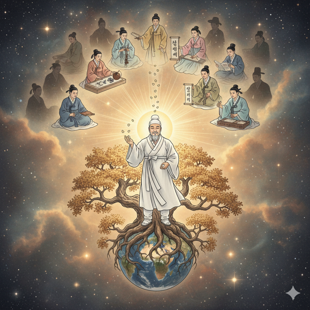 한글 (Korean - ~290자): 고요하고 영적인 동양화풍의 우주 공간. 중앙에는 힘차게 빛나는 대한민국 지도가 떠 있고, 그 아래에는 황금빛으로 빛나는 거대한 고목나무 뿌리가 지구를 감싸 안고 있습니다. 나무의 뿌리와 지도 사이에서 단정하게 흰색 도포를 입은 지혜로운 현인(賢人)이 인자한 미소를 지으며 빛나는 씨앗들을 위로 띄워 올리고 있습니다. 그 위로는 단정하고 다양한 복장의 사람들이 각자의 문화 활동(악기 연주, 그림 그리기, 책 읽기)에 몰두하며 빛나는 에너지를 발산합니다. '인간'의 그림자가 점차 사라지고 '사람'의 밝은 형상이 돋보이는 구글 나노 바나나 스타일의 감성적인 콜라주로 표현합니다.
