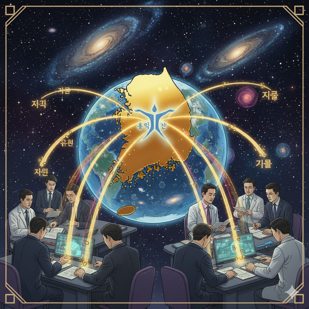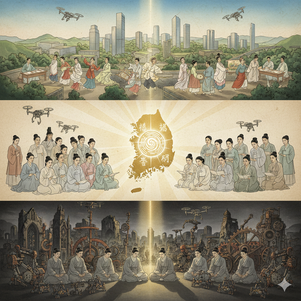 고요하고 영적인 우주 공간, 거대한 고목나무가 빛나는 은하수를 배경으로 뿌리 깊게 서 있습니다. 그 뿌리 주위에는 푸른빛으로 빛나는 대한민국 지도가 둥실 떠 있고, 지도 위로 **다양한 인종의 단정하게 옷을 입은 사람들이 손을 맞잡고 서서, 지구촌 곳곳에서 흘러 들어오는 지식과 문화의 '씨앗'(빛나는 에너지 구체)**들을 두 손으로 받아 정성스레 돌보고 있습니다. 고목나무 가지에서는 낡은 시계 부품들이 얽힌 '노동의 굴레'에서 벗어나 활짝 웃으며 창의적인 '문화 활동'(예술, 토론, 명상)에 몰두하는 '사람'들의 모습이 빛을 발합니다. '인간'에서 '사람'으로의 진화, '노동'에서 '문화 활동'으로의 전환, 그리고 인류 문명을 이끄는 대한민국의 '뿌리' 역할을 구글 나노 바나나 스타일의 영적이고 장엄한 동양화풍 콜라주로 표현합니다.