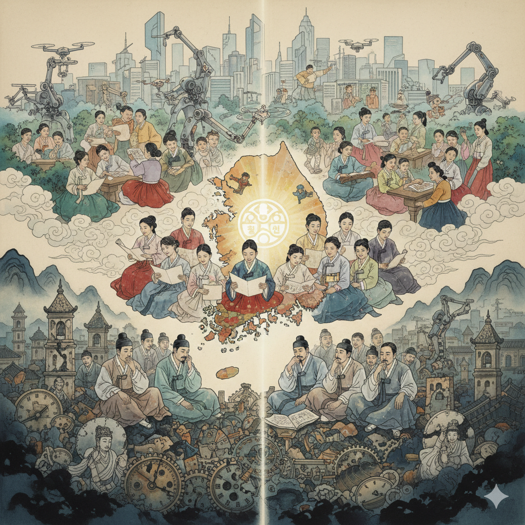 한글 (Korean - ~290자): 한 폭의 동양화풍 콜라주 화면이 대각선으로 극명하게 나뉩니다. 왼쪽 어두운 절반에는 낡고 부서진 거대한 시계 태엽들이 혼란스럽게 얽혀 있고, 단정하게 옷을 입은 사람들이 체념한 듯 그 위를 걸어가거나, 신에게 매달려 고통스럽게 기도하는 모습을 그립니다. 희미한 불빛이 불안감과 정체를 상징합니다. 오른쪽 밝은 절반에는 환한 빛이 감도는 대한민국 지도가 떠오르고, 단정한 옷을 입은 다양한 인종의 사람들이 환한 미소로 서로 손을 맞잡고 새로운 문화(예술, 기술, 교육)를 창조하는 모습을 그립니다. '홍익인간' 글자가 황금빛으로 빛나며 희망적인 미래를 상징하고, 구글 나노 바나나 스타일로 인류의 고뇌와 희망, 그리고 대한민국의 긍정적, 비판적 역할을 극명하게 대비시켜 표현합니다.