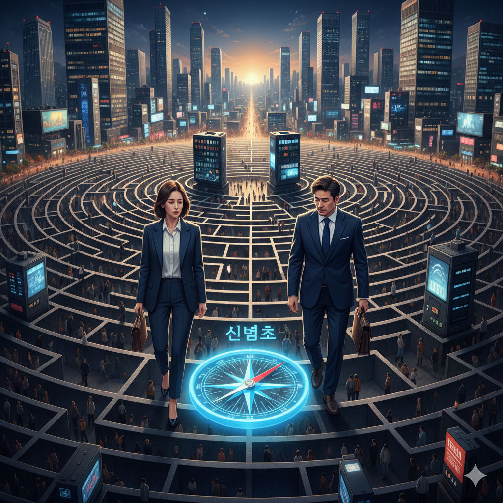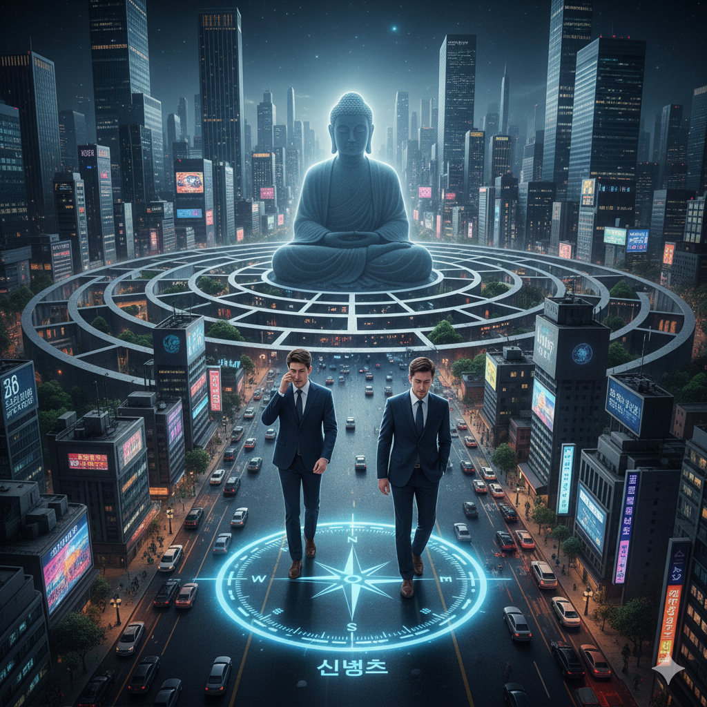 English: A serene, spiritual, and emotional East Asian style collage for the e-book cover. In the center, a labyrinth of a complex modern city (tall buildings, dense traffic, glowing digital screens) unfolds. Within this maze, a neatly and stylishly dressed modern man and woman are searching for a path with expressions of contemplation. In the middle of the labyrinth, a transparent, blue-glowing compass engraved with 'Shin-nyeom-cheo' emerges from beneath their feet, its needle pointing towards the silhouette of a meditating Buddha, faintly shining. The faces of the man and woman show anguish, but a faint smile of hope and peace appears as they discover the compass. The overall atmosphere is mysterious and inspiring, suggesting wisdom in finding one's way through complexity.