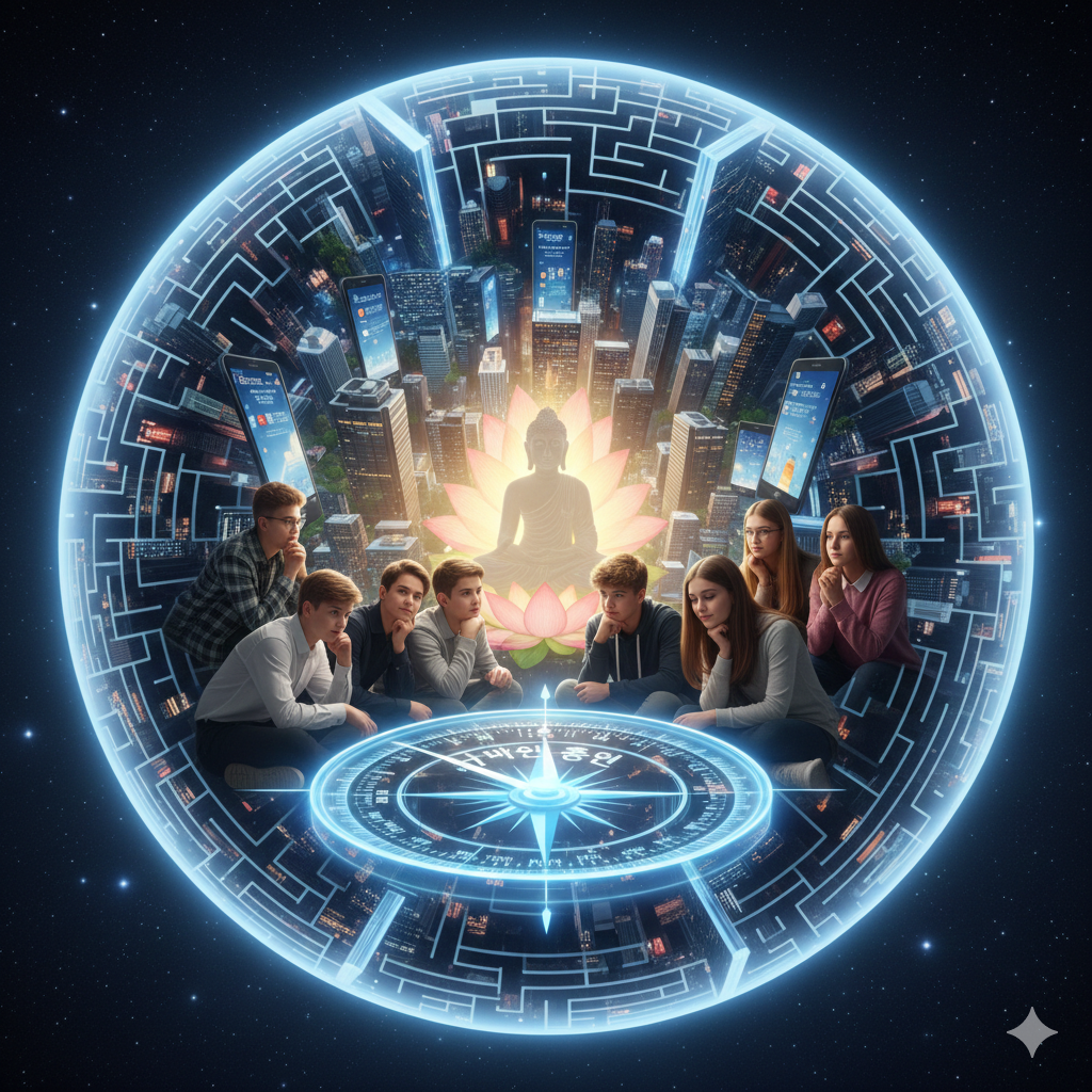 한글: 밝고 따뜻하며 살짝 신비로운 구글 나노 바나나 스타일 콜라주. 밤하늘을 배경으로 한 고요한 우주 공간에 빛나는 지구본이 떠 있습니다. 지구본 중앙에는 '마음 감옥'처럼 복잡하게 얽힌 현대 도시의 미로(빛나는 빌딩, 끊임없이 스크롤되는 스마트폰 화면)가 펼쳐져 있고, 그 미로 속에서 다양한 국적의 청소년들(모두 단정하고 트렌디한 스트릿 캐주얼 복장을 입음)이 고민하는 표정으로 서로에게 기대거나 손을 뻗어 길을 찾고 있습니다. 미로의 한가운데, 아이들의 발밑에서 투명하고 푸른빛을 발하는 '나만의 중심'이라는 글자가 새겨진 반짝이는 나침반이 솟아나오고, 그 나침반 바늘은 고요히 빛나는 명상하는 부처님 실루엣을 향합니다. 부처님 실루엣 뒤로는 깨달음의 연꽃이 피어나 희망의 빛을 발하고, 이 빛은 청소년들의 얼굴을 비추며 고뇌가 서린 표정에서 희미한 미소와 평온함으로 변화합니다. English: A bright, warm, and slightly mysterious Google Nano Banana style collage for the e-book cover. Against a night sky, a glowing globe floats in serene cosmic space. At the center of the globe, a labyrinth of a complex modern city (shining buildings, endlessly scrolling smartphone screens) representing a 'mind prison' unfolds. Within this maze, teenagers of diverse nationalities (all neatly dressed in trendy street casual wear) are searching for a path, some leaning on each other, others reaching out, their faces filled with contemplation. In the middle of the labyrinth, a sparkling compass engraved with 'My Own Center', emitting a transparent blue light, emerges from beneath their feet, its needle pointing towards the silhouette of a meditating Buddha, faintly shining. Behind the Buddha's silhouette, a lotus of enlightenment blooms, radiating hope. This light illuminates the teenagers' faces, transforming their anxious expressions into faint smiles and peaceful serenity.