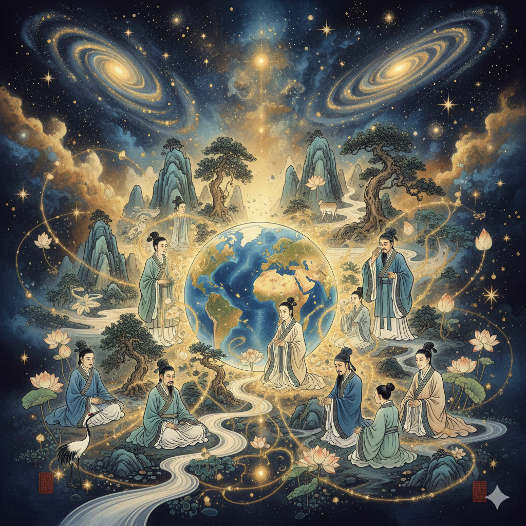 - 우주 세포와 에너지 흐름이 시각적으로 연결되어 있고, 자연과 인간, 우주가 하나로 어우러진 신비롭고 영적인 동양화풍 콜라주 스타일.
