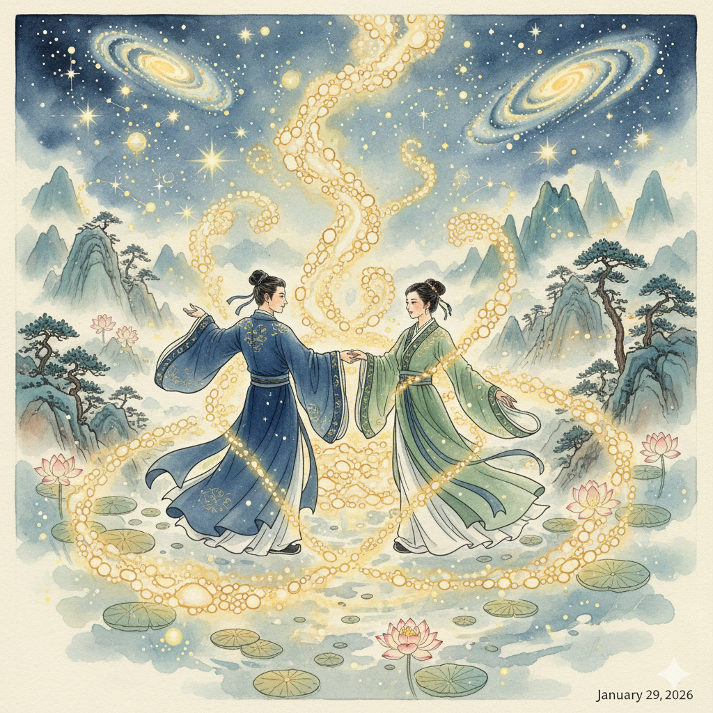 고요한 밤하늘에 별빛처럼 빛나는 에너지가 세포 형태로 퍼지고, 단정한 옷을 입은 남녀가 손을 맞잡고 춤추듯 연결돼 있다. 배경은 우주와 자연이 융합된 신비롭고 평화로운 동양화풍 이미지.