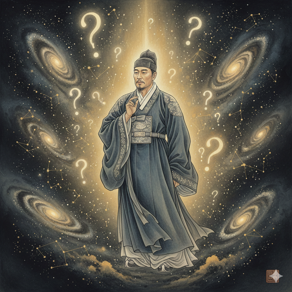 질문하는 인물이 단정한 옷차림으로 우주 배경 앞에서 사색하는 모습. 우주 공간에 미묘한 빛줄기와 의문표가 동양화풍으로 표현됨.