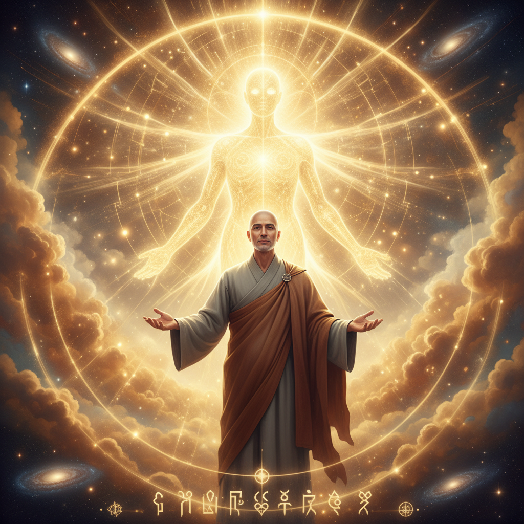 우주의 거대한 공간을 배경으로 거대한 빛나는 에너지 구슬이 중심을 잡고, 그 주변에 여러 명의 단정한 옷차림 인물이 세포와 빛줄기가 연결된 신비로운 에너지 속에 선 모습. 자연과 별, 물, 산, 인간이 영적인 동양화풍 콜라주로 표현되어 우주와 신의 ‘오픈’과 내재성, 조화를 상징한다.