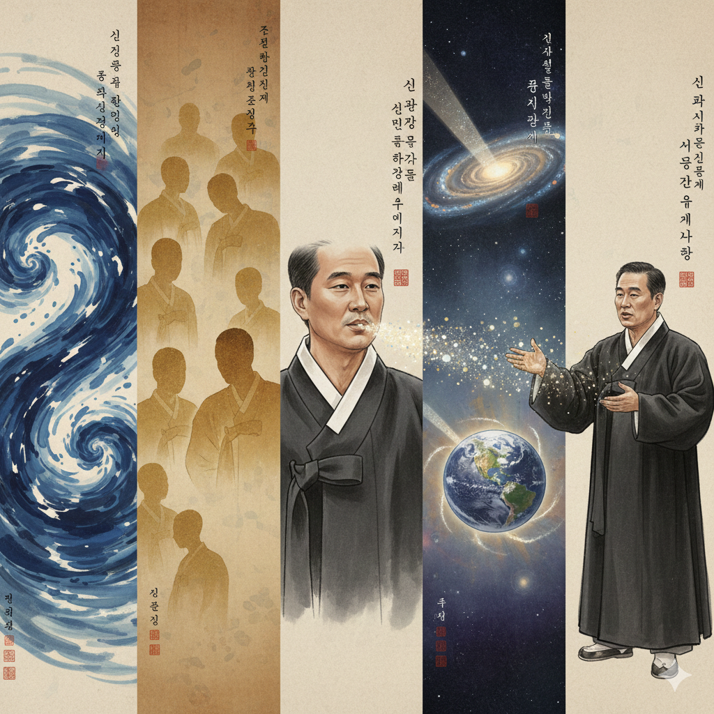 - 우주 배경 위에 은하와 지구가 퍼져 있고, 좌측에는 반투명한 물질 에너지(푸른 빛), 우측에는 황금빛의 비물질 에너지(영혼 실루엣들)가 춤추듯 흐른다. 중앙에는 정장 또는 단정한 한복 차림의 남녀(청중을 대표)가 서로 대화하며, 그들의 말에서 작은 빛 입자(지식·진리)가 흘러 우주 기운을 연결하는 모습을 동양화풍 콜라주로 표현. 인물들은 단정한 옷 착용.