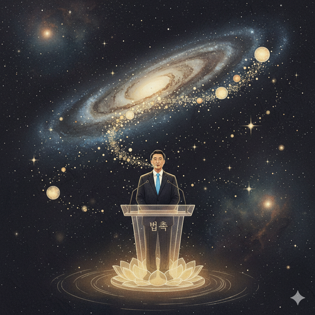 - 한국어(≈300자): 어두운 우주를 배경으로 중앙에 반투명한 연단(법석) 위에 단정한 옷을 입은 화자가 서 있다. 그의 입에서 흘러나온 말(빛의 실타래)이 공중에서 흩어져 작은 반짝이는 씨앗들이 되고, 그 씨앗들이 모여 작은 별이나 구체로 성장하여 멀리 은하의 궤도에 닿아 잔잔한 파동을 일으킨다. 전체는 따뜻한 동양화풍 콜라주 질감, 인물은 단정한 옷 착용, 분위기는 명상적이고 희망적.