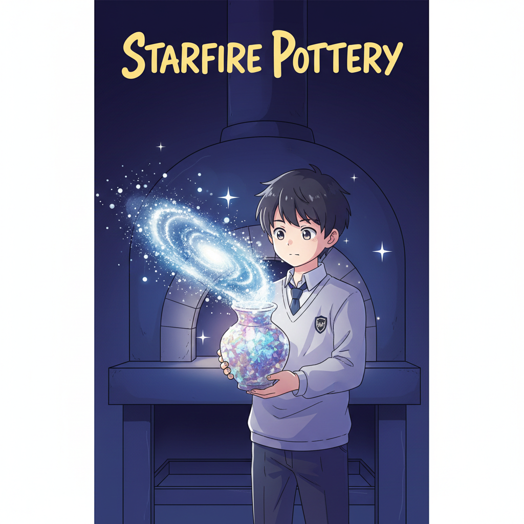 [이미지 설명] 밝고 청량한 느낌의 애니메이션 아트 스타일입니다. 교복을 입은 한 소년이 밤하늘처럼 깊은 가마(Kiln) 앞에 서 있고, 그가 든 투박한 흙병에서 눈부신 은하수 같은 빛이 새어 나오고 있습니다. 빛이 닿는 곳마다 흙병이 단단하고 영롱한 보석 도자기로 변해가는 모습이 드라마틱하게 묘사됩니다. 제목은 귀엽지만 힘 있는 손글씨(캘리그래피)로 강조되어 있으며, 전체적으로 '성장'과 '희망'을 상징하는 밝은 노란색과 보랏빛이 어우러져 있습니다.