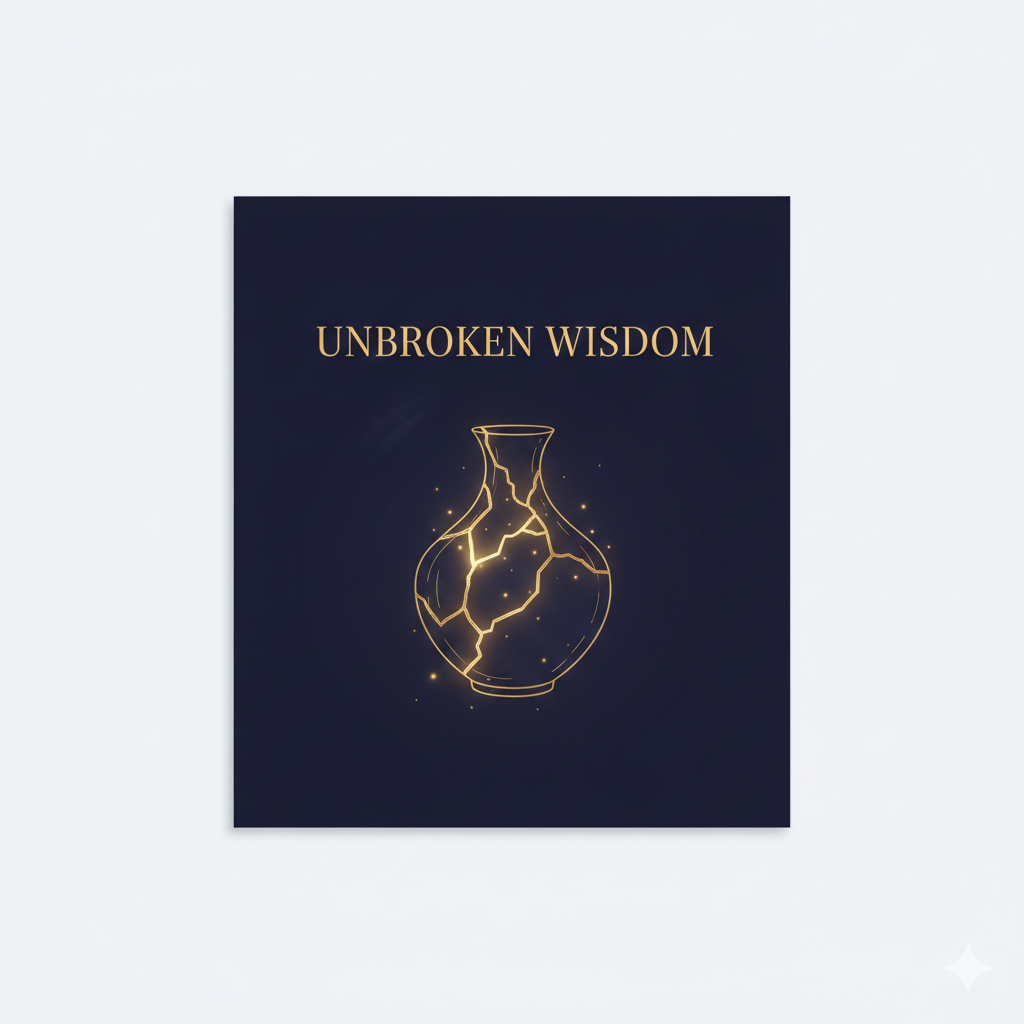 [이미지 설명] 미니멀리즘과 세련된 동양미가 결합된 디자인입니다. 짙은 남색(Deep Indigo) 배경 위에 가느다란 황금색 선으로 그려진 **'금이 간 듯하지만 단단하게 결합된 도자기'**가 중앙에 배치되어 있습니다. 도자기의 금 간 틈새에서는 눈부신 빛이 새어 나옵니다(Kintsugi 기법 원용). 그 위로 세리프체(Serif)의 우아한 타이포그래피로 제목이 적혀 있습니다. 전체적으로 '절제된 지혜'와 '회복탄력성'을 시각화합니다.