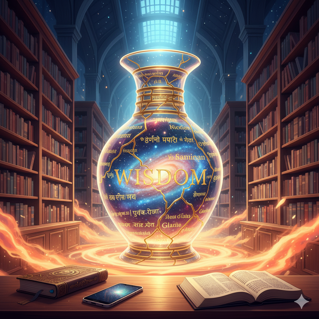 [Image Info] Hot heat from a kiln flows between the shelves of a vast library, and at its center floats a transparent, glowing ceramic jar. Inside the jar is a vast universe, and its surface is embroidered with the word 'Wisdom' in languages from around the world in gold thread. A smartphone and an ancient scripture lie side by side, a sophisticated illustration showing this fable is a bridge between the modern and the classical.