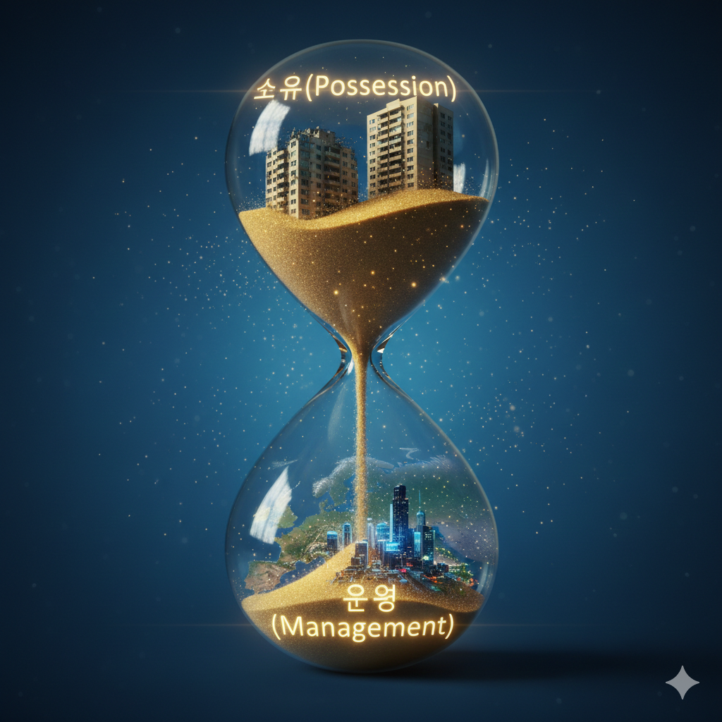 이미지 프롬프트: "초현실주의적인 디지털 아트. 거대한 모래시계 안에서 낡은 아파트 건물이 황금빛 모래(에너지)로 변해 아래쪽으로 흐르며 광활한 유라시아 대륙과 스마트 시티를 형성하는 모습. 모래시계 위에는 '소유(Possession)'라는 글자가 흐려지고, 아래에는 '운용(Management)'이라는 글자가 선명하게 빛남. 전체적으로 청량한 블루와 고귀한 골드 톤의 조화."
