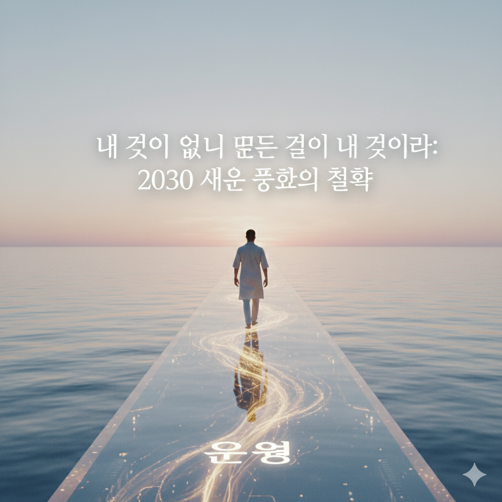 프롬프트: "끝없는 수평선이 펼쳐진 새벽녘의 바다 위, 한 사람이 공중에 떠 있는 빛의 길을 따라 걷고 있습니다. 발밑의 땅은 투명하게 비치며 그 안에는 황금빛 에너지의 흐름이 보입니다. 전체적으로 몽환적이고 신비로운 분위기이며, 중앙에는 '내 것이 없으니 모든 것이 내 것이라: 2030 새로운 풍요의 철학'이라는 제목이 우아한 세리프체로 적혀 있습니다."