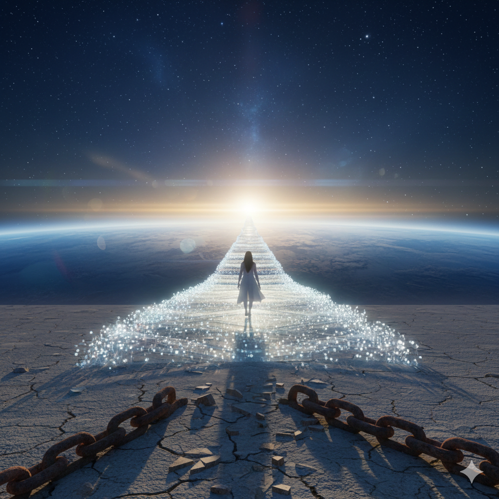 - 이미지 프롬프트: "초현실주의적인 3D 그래픽. 하단에는 무겁고 낡은 쇠사슬(소유의 집착)이 끊어져 흩어져 있고, 그 위로 투명하고 빛나는 유리 다리가 끝없는 대륙과 우주를 향해 뻗어 있습니다. 한 사람이 가벼운 차림으로 그 길을 당당히 걷고 있으며, 배경은 새벽의 푸른빛과 황금빛이 교차하는 희망찬 분위기입니다. "