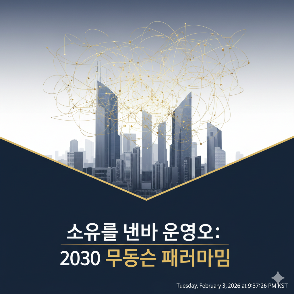 프롬프트: "현대적인 고층 빌딩 숲 위로 투명하고 가벼운 황금색 선들이 그물처럼 얽혀 있는 모습. 하단에는 '소유를 넘어 운용으로: 2030 부동산 패러다임'이라는 제목이 세련된 산세리프 서체로 적혀 있음. 배경은 차분한 네이비와 화이트 톤을 사용해 신뢰감을 주며, 전체적으로 '무거움'이 아닌 '지혜로운 흐름'을 시각화한 그래픽 디자인."