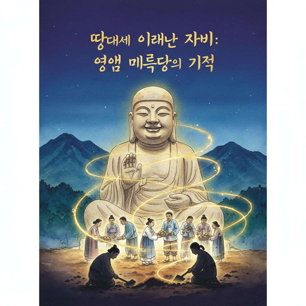 [한글] 깊고 푸른 밤하늘 아래, 월출산의 정기가 서린 영암 광암마을을 배경으로 합니다. 화면 중앙에는 3.6m 높이의 거대한 석조 미륵불이 온화한 미소를 지으며 서 있고, 그 몸체에서는 부드러운 황금빛이 뿜어져 나옵니다. 불상 아래쪽에는 과거의 정씨 부부가 정성껏 땅을 파는 실루엣과, 현재의 마을 사람들이 서로의 손을 맞잡고 나눔을 실천하는 모습이 겹쳐져 있습니다. 표지 상단에는 **'땅에서 일어난 자비: 영암 미륵당의 기적'**이라는 제목이 금색 캘리그라피로 새겨져 있어, 세대를 아우르는 희망과 진리의 빛을 시각화합니다.