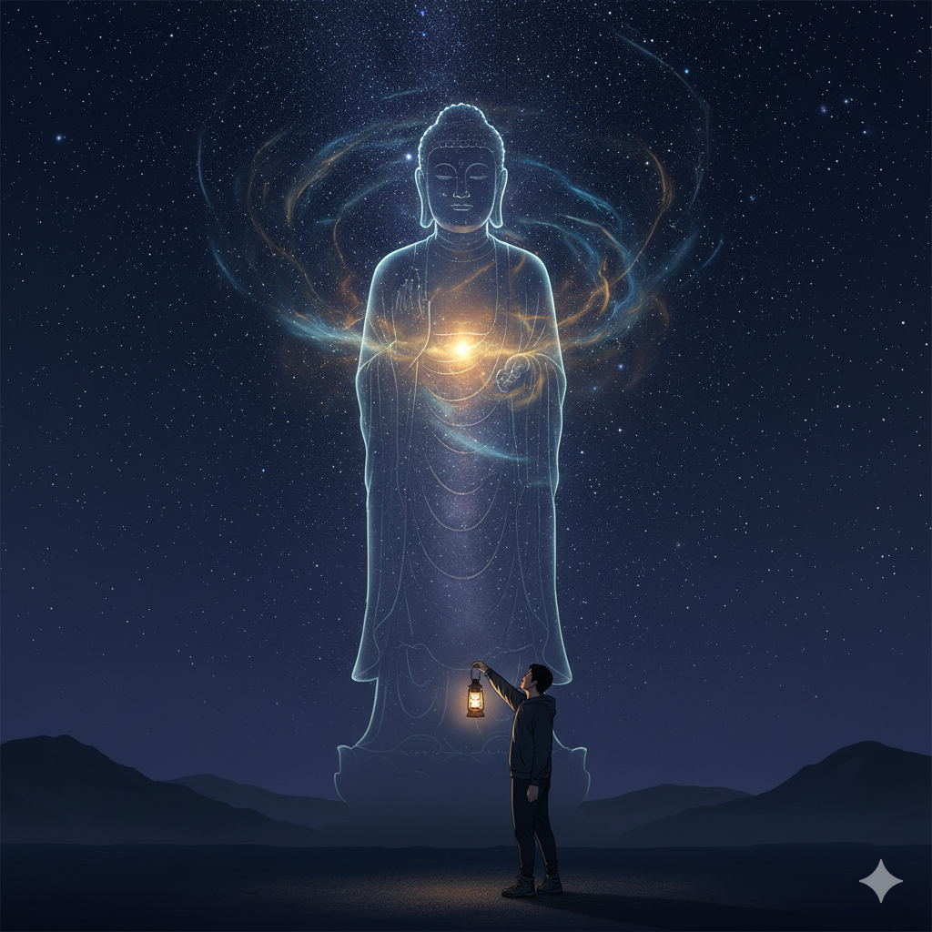 - 시각적 요소: 짙은 감색(Indigo)의 밤하늘과 은하수를 배경으로, 화면 중앙에는 투명하고 신비로운 빛을 내뿜는 3.6m 높이의 미륵불 실루엣이 세로로 길게 배치됩니다. 불상의 발치에는 현대적인 복장의 한 남자가 작은 등불을 들고 서서 불상을 올려다보고 있으며, 불상의 가슴 부근에는 따뜻한 황금빛이 심장처럼 빛나고 있습니다.