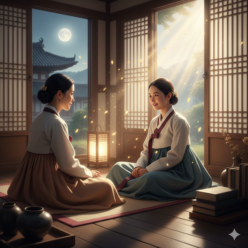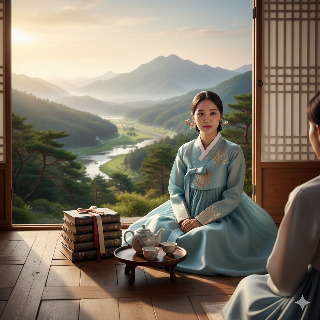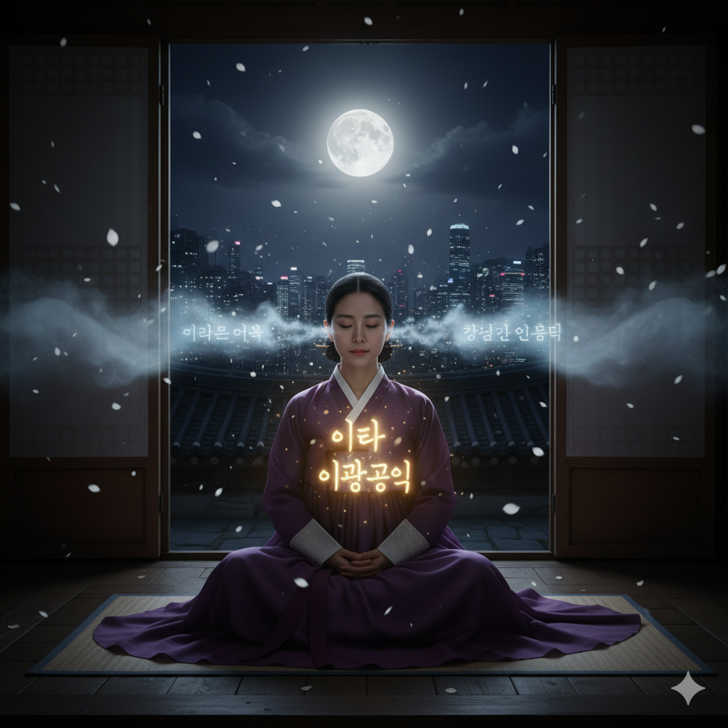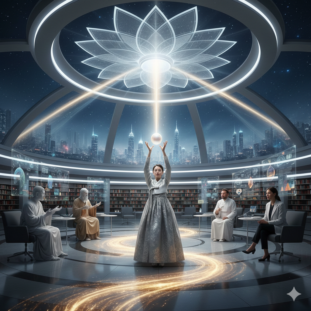 Image Info (English): Above a mysterious planet where futuristic skyscrapers and lush ancient forests coexist, a giant 'Sun of Truth' rises. In the center, a woman in a Hanbok made of shimmering Milky Way silk sits in mid-air meditation. Countless golden threads originating from her chest connect futuristic data centers and ancient Hanoks like a web, through which the energy of 'Listening' and 'Wisdom' flows at the speed of light. In the sky, geometric patterns symbolizing the fundamental principles of the universe are engraved inside a massive lotus, depicting a grand cosmic epic where all beings coexist peacefully under this light.