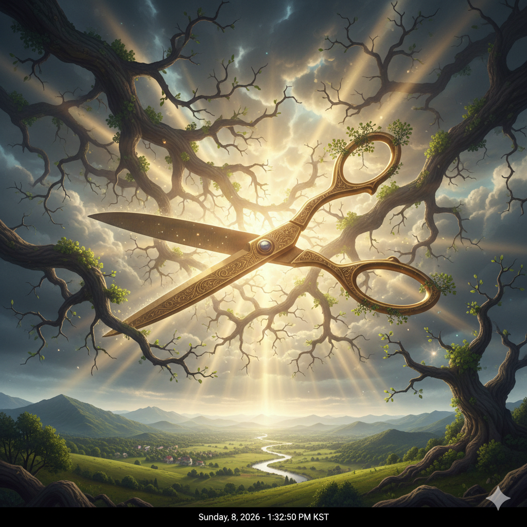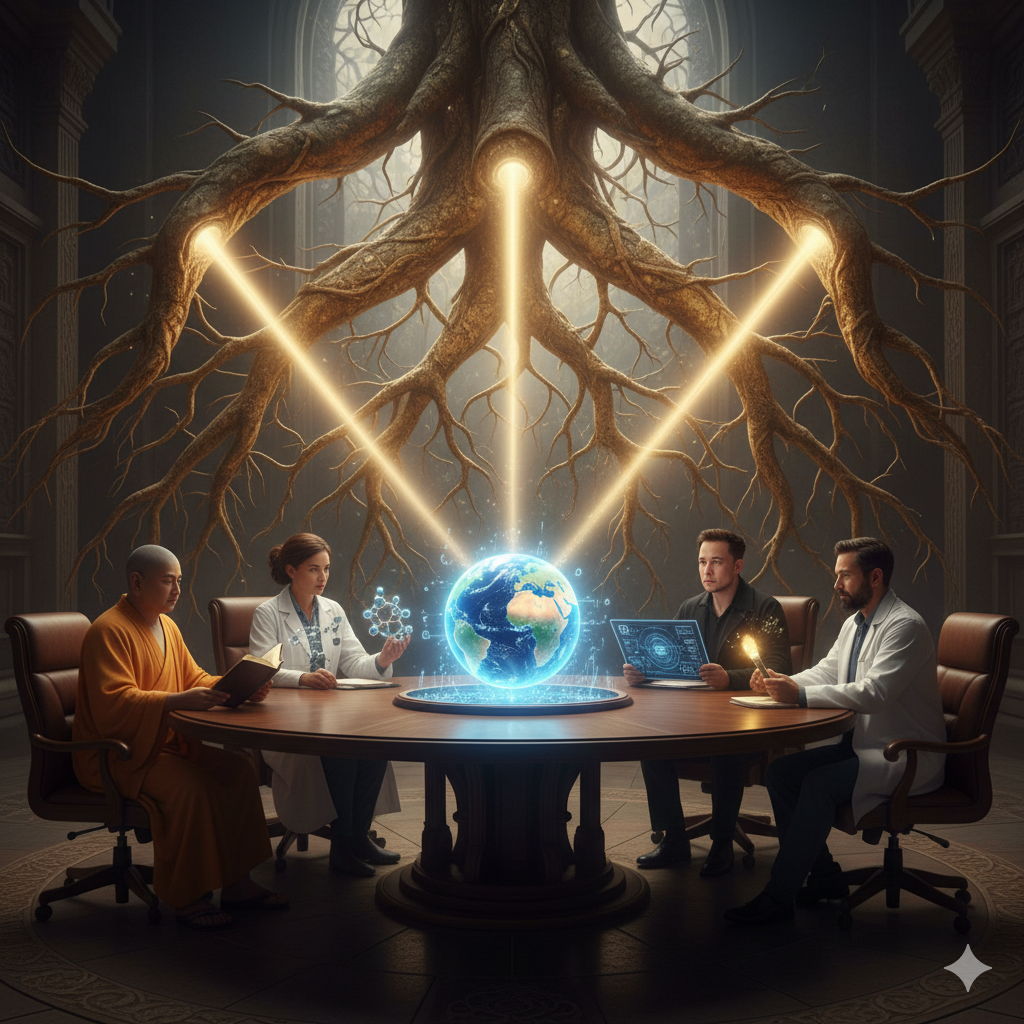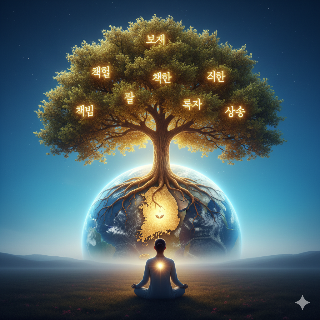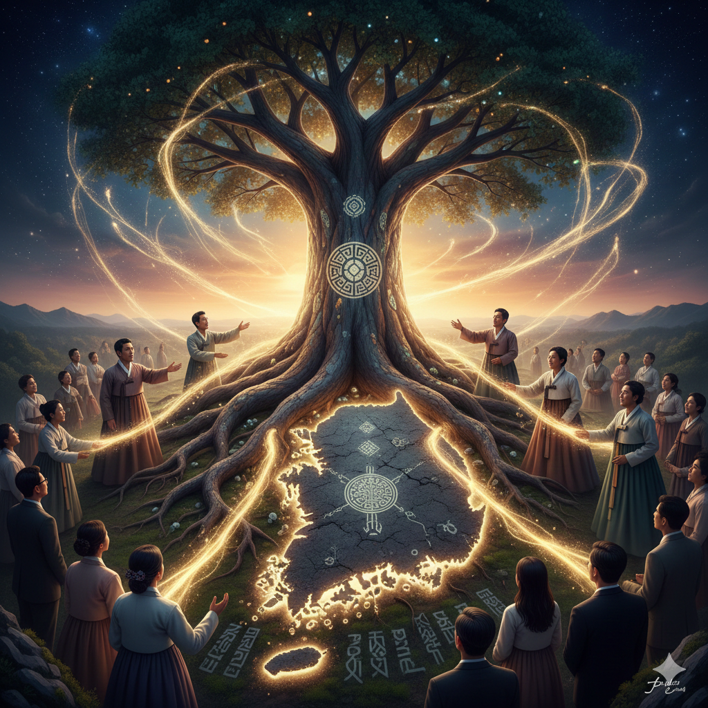 이미지 묘사: 거대한 지혜의 저울이 공중에 떠 있습니다. 저울 한쪽에는 '비판적 이성'을 상징하는 차가운 푸른 빛의 수정이, 다른 한쪽에는 '긍정적 영성'을 상징하는 따뜻한 황금빛 태양이 균형을 이루고 있습니다. 저울의 받침대는 한반도 모양의 뿌리가 지탱하고 있으며, 그 주변으로 세계 각국의 사람들이 서로 평등하게 손을 맞잡고 인류라는 거대한 나무를 돌보는 모습입니다.