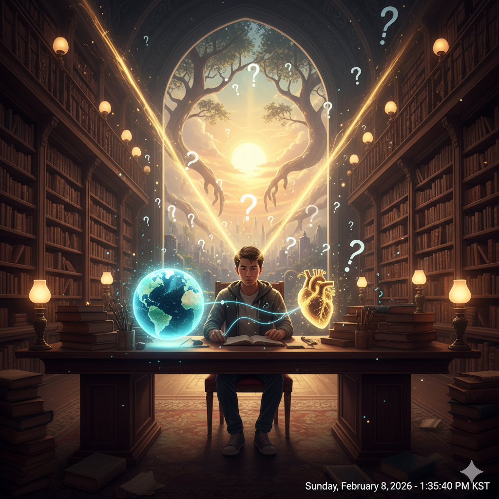 이미지 묘사: 한 사람이 거대한 도서관의 책상에 앉아 있는데, 그 책상 위에는 '지구'와 '자신의 심장'이 연결된 홀로그램이 떠 있습니다. 사람의 머릿속에서 나온 수많은 물음표(?)들이 황금빛 빛줄기로 변하여 지구의 아픈 곳들을 하나둘씩 메우고 있습니다. 창밖으로는 인류라는 나무의 가지들이 하늘 높이 뻗어 나가는 희망찬 새벽녘의 풍경이 보입니다.