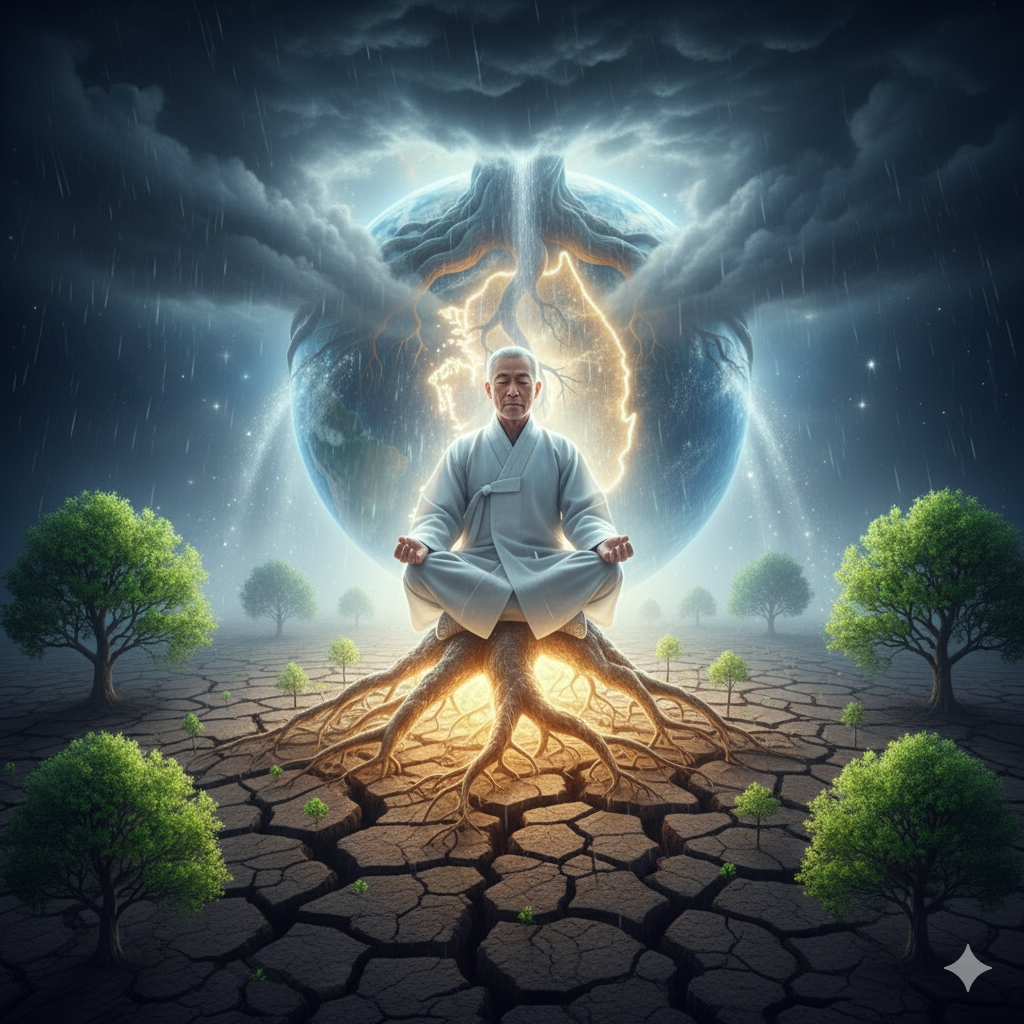- 천인합일(天人合一)의 상호작용: 인간과 대자연은 별개의 존재가 아니라 하나의 에너지망으로 연결되어 있다는 것입니다. 인간의 '탁한 기운(욕심, 갈등)'은 자연의 질서를 어지럽히고, 인간의 '맑은 기운(바른 삶, 홍익)'은 자연을 안정시킨다는 에너지적 진리를 설파합니다.
