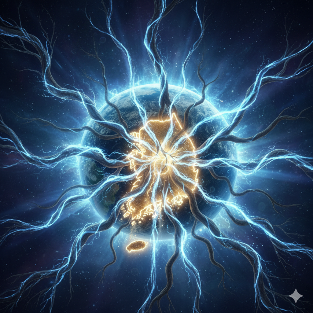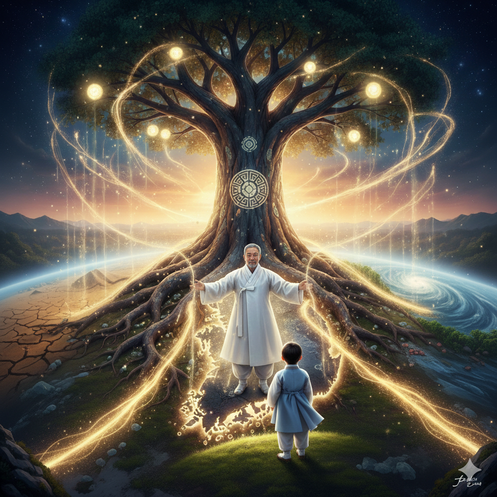 [이미지 묘사] 투명한 지구 안에서 금빛 맥동이 흐르고 있으며, 그 중심에 한반도가 위치해 있습니다. 한반도에서 뿜어져 나오는 온화한 황금빛 파동이 지구를 겹겹이 감싸며 보호막(Shield)을 형성하고 있습니다. 이 보호막 위로 과거의 성인들과 현대의 지식인들이 서로의 손을 잡고 원을 그리며 서 있고, 그들이 바라보는 미래는 폭풍이 걷히고 모든 생명이 조화롭게 공존하는 찬란한 빛의 세계입니다.