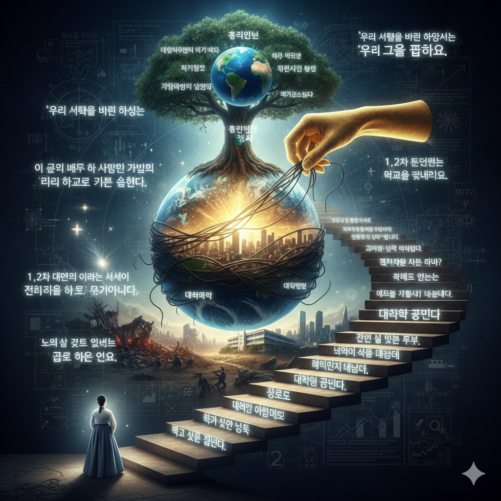 - 뿌리의 역할: "대한민국이 인류의 뿌리라면, 현재 우리 사회의 갈등(세대, 젠더, 이념 등)은 뿌리가 썩고 있다는 신호 아닐까요? 이 갈등을 치유할 한국만의 '정신적 가치'는 무엇이 되어야 할까요?"