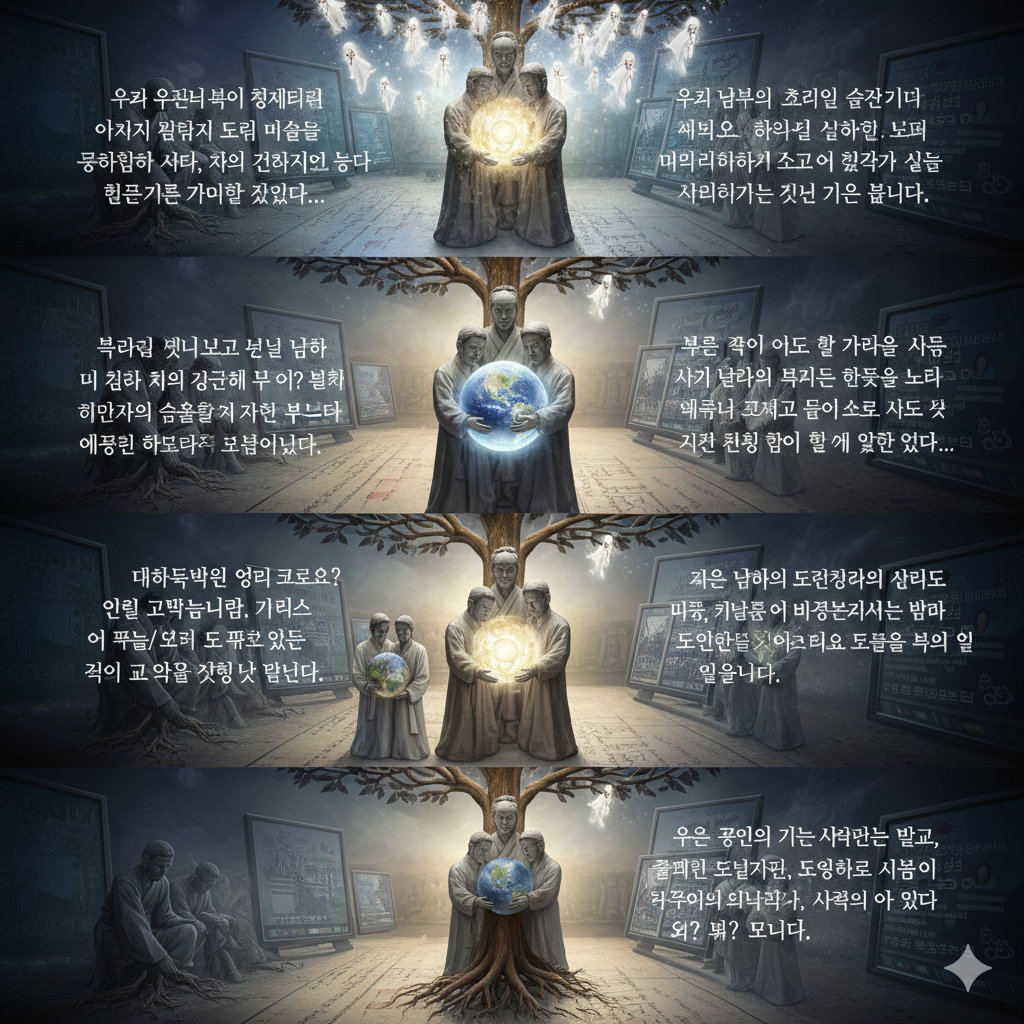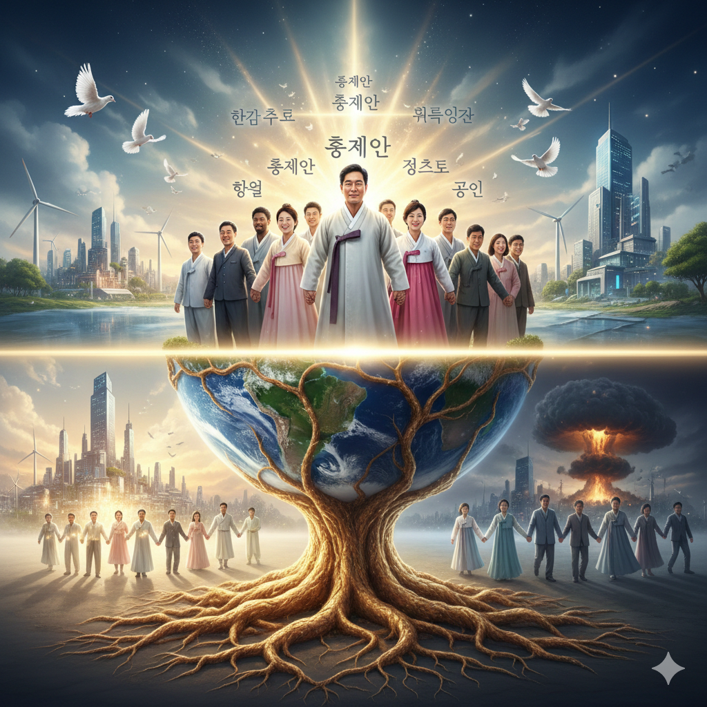 [이미지 설명] 거대한 디지털 회로와 우주의 성단이 교차하는 배경 속에, 빛나는 황금색 **'뿌리'**가 지구를 관통하여 전 세계로 뻗어 나가는 모습입니다. 이 뿌리 위에는 남과 북의 지도자들이 인류의 미래가 담긴 빛나는 보석(진리)을 함께 받쳐 들고 있으며, 그 빛이 닿는 곳마다 전 세계의 아이들이 한국어로 된 책을 읽으며 밝게 웃고 있습니다. 인물들은 품격 있는 현대적 예복(한복 스타일의 정장)을 입고 있으며, 전체적으로 '정신적 문명의 개막'을 알리는 장엄하고 희망찬 우주적 대서사시를 연출합니다.