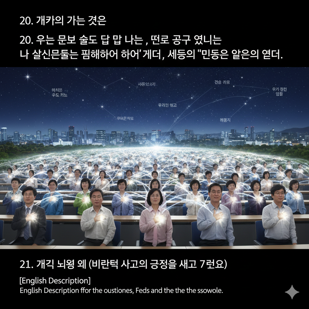 [이미지 설명] 거대한 디지털 도서관과 고대 신전이 융합된 공간 속에, 인종과 국적이 다른 수많은 지성인이 모여 앉아 있습니다. 그들 앞에는 투명한 빛으로 된 '질문함'이 있고, 거기서 뿜어져 나오는 질문의 파동들이 공중에서 기하학적인 문양을 그리며 서로 연결됩니다. 공간 중앙에는 대한민국을 상징하는 황금빛 뿌리가 기둥이 되어 하늘을 떠받치고 있으며, 지성인들은 단정한 현대적 예복과 학자풍의 옷을 입고 진지하게 토론하고 있습니다. 이는 강의의 메시지가 끝이 아닌, 새로운 인류 문명을 설계하기 위한 거대한 문답의 시작임을 상징합니다.