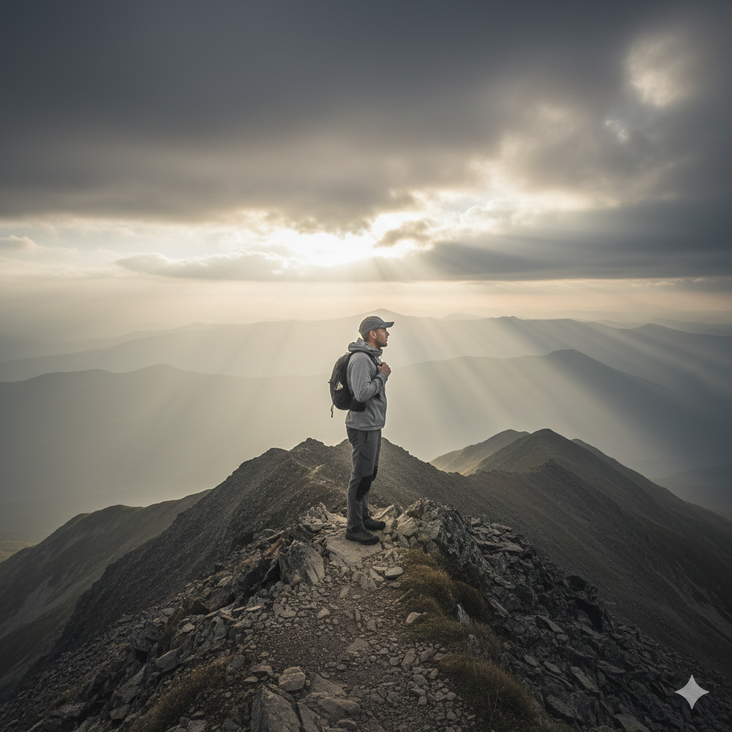- 한글: 안개가 자욱한 미로 속에서 한 남자가 세련된 화이트 린넨 셔츠를 입고 발밑을 비추는 작은 등불 하나를 들고 있습니다. 미로의 벽면에는 위 질문들이 거울처럼 붙어 있어 남자의 모습을 비추고 있습니다. 남자가 질문 하나에 답할 때마다 안개가 걷히고 미로의 벽이 무너지며 광활한 황금빛 들판으로 나가는 길이 열립니다. 스스로에게 던지는 질문이 곧 어둠을 밝히고 길을 만드는 **'지혜의 열쇠'**임을 상징합니다.