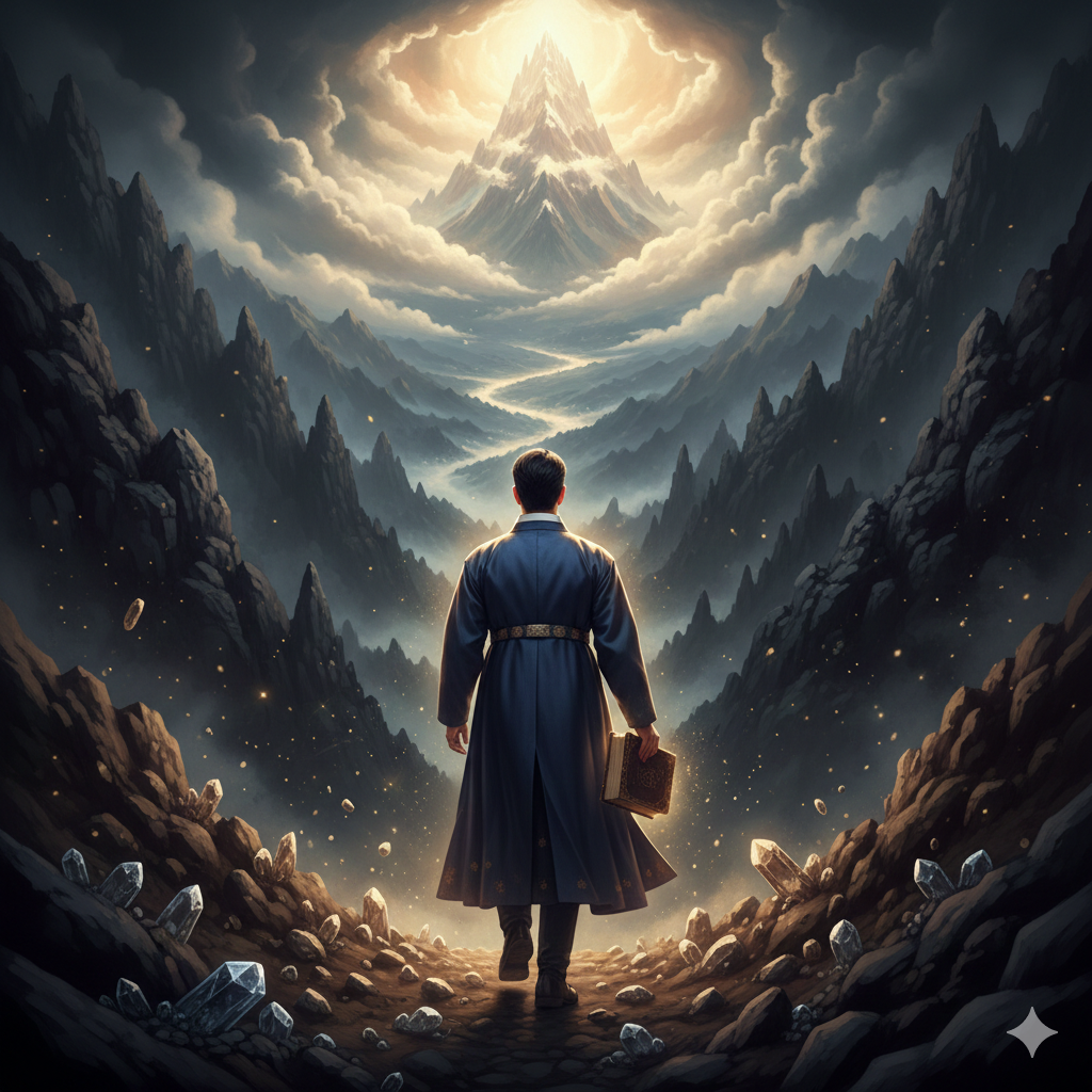 - English: A giant compass sits in the center of the frame. The needle trembles between a golden light (positive thinking) and a blue light (critical thinking). Below the compass, a rugged rocky terrain (past mistakes) transitions into a flowery meadow (future repayment). Beside the compass stands a figure in a sophisticated white suit, holding a book of Dharma in one hand and the scales of justice in the other. This symbolizes the attitude of an enlightened intellectual who accepts mystical teachings while never ceasing to balance them with realistic ethics and responsibility.