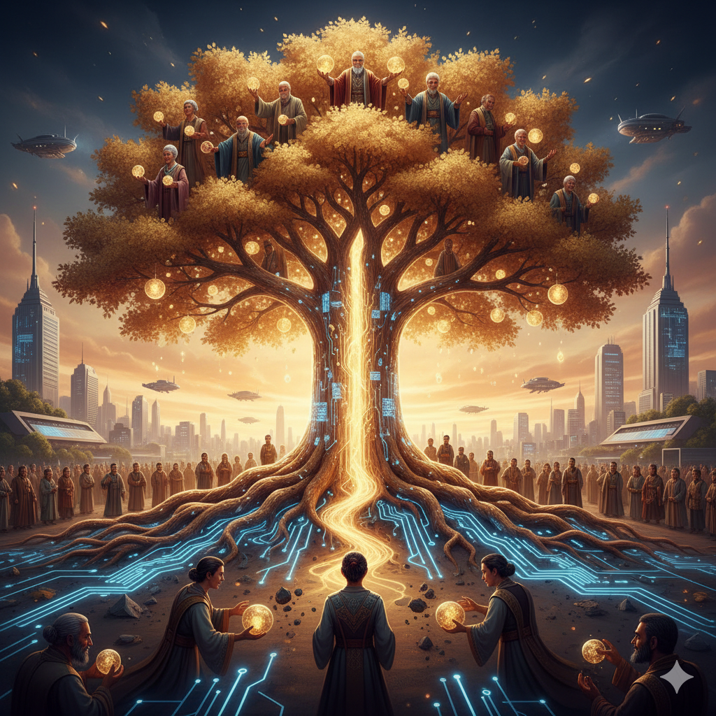- English Information: A majestic golden tree stands at the center of society. Its roots are AI digital circuits for fair distribution, and its transparent trunk reveals flowing golden energy (pension funds). On the branches, elders produce and share fruits of wisdom with youth. Below, the fruits turn to black ash in the hands of those trying to hoard them out of greed. A grand scene where abundance, wisdom, and the strict laws of nature coexist harmoniously. (375 characters)