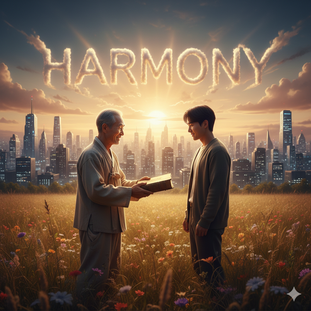 - 한글 정보: 노을이 지는 들판에서 한 어르신이 젊은이에게 오래된 책(지혜)을 건네주며 따뜻하게 미소 짓고 있습니다. 어르신의 주머니는 비어 있지만, 그를 감싸는 아우라는 황금빛으로 찬란합니다. 멀리 배경에는 현대적인 AI 도시가 질서 정연하게 빛나고 있고, 하늘에는 구름이 모여 '조화(Harmony)'라는 형상을 만들고 있습니다. 물질을 넘어선 정신의 풍요로움을 표현한 서정적인 이미지입니다. (255자)