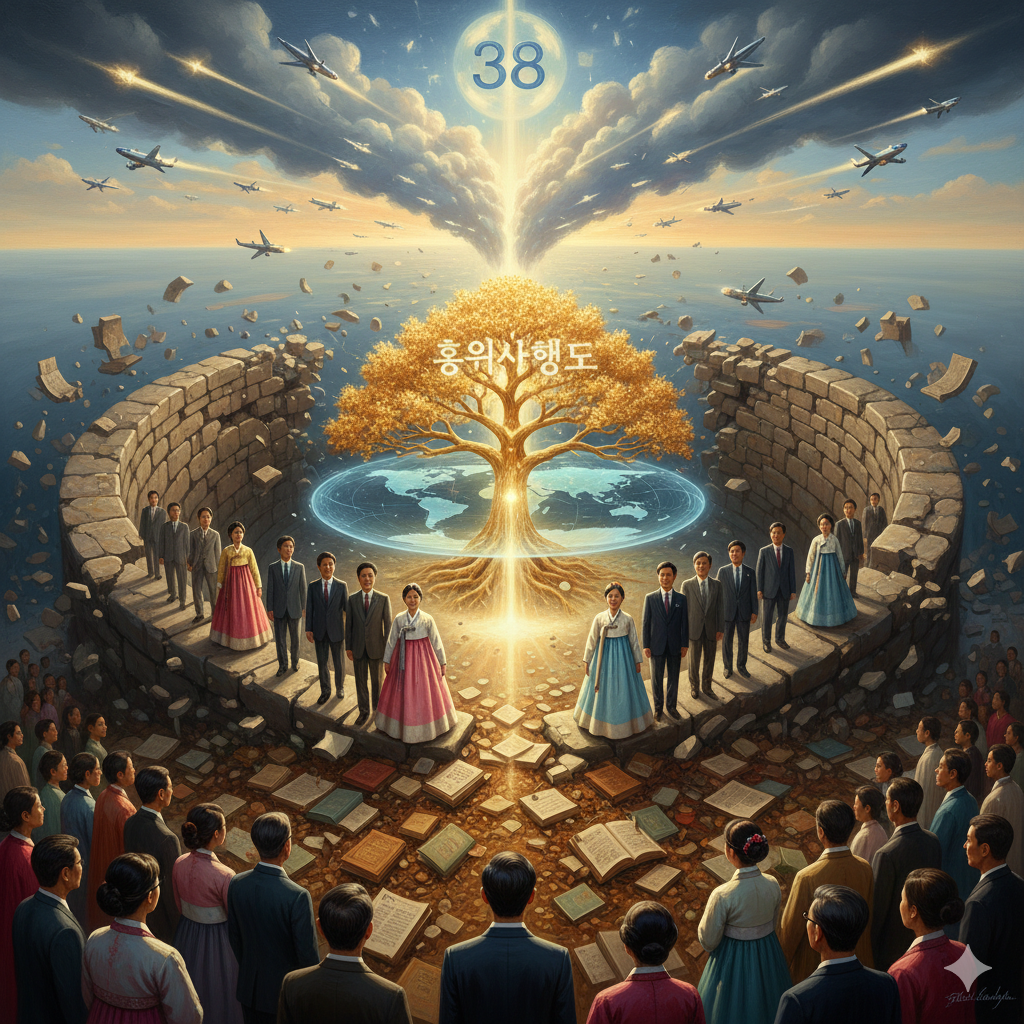 - 현대적 확장: 대한민국이 좁은 반도에 갇혀 치열하게 경쟁해온 역사는 전 세계의 지식과 갈등을 압축해서 풀어내는 **'정신적 테스트베드(Test-bed)'**였음을 의미합니다. 38선은 단순한 분단이 아니라, 가장 극단적인 이념과 갈등을 한곳에 모아두고 이를 극복할 지혜를 짜내게 만든 '보호막'이자 '훈련장'이었습니다. 이제 그 수련이 끝났기에 비행기(글로벌 네트워크)를 타고 세계로 나가는 것입니다.